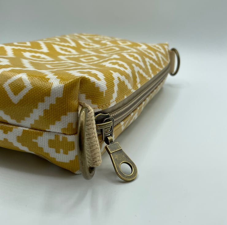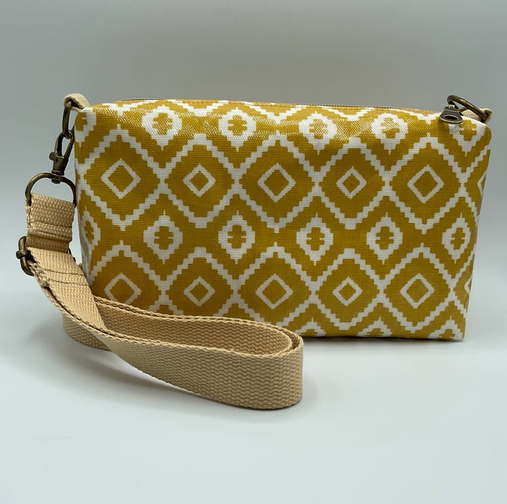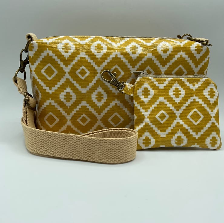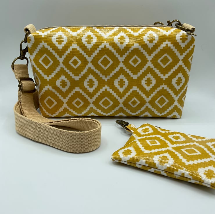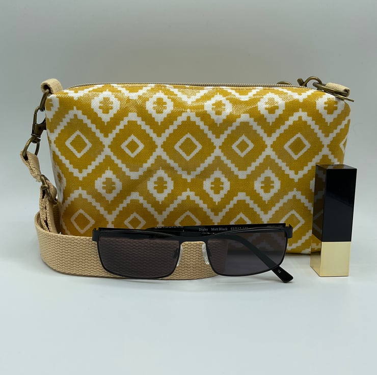 This crossbody bag has been made from oilcloth fabric, with a yellow cotton lining.