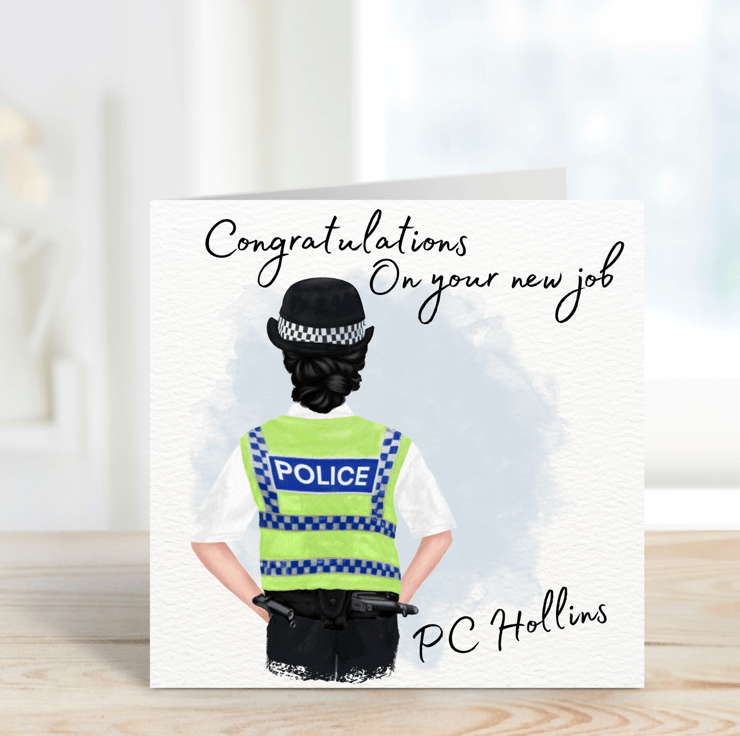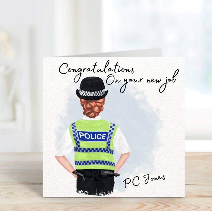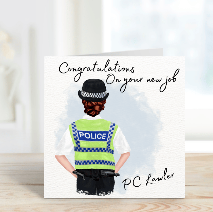 Congratulations on your new job or promotion within the police force. This card shows that you are thinking of them and their hard work to achieve this job or promotion. Personalised with their hair colour, name or police ranking.