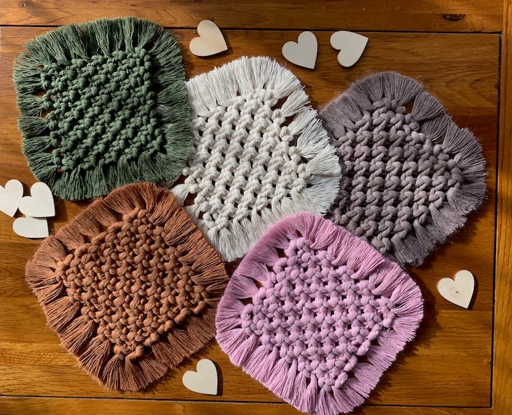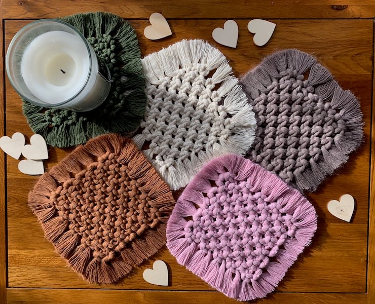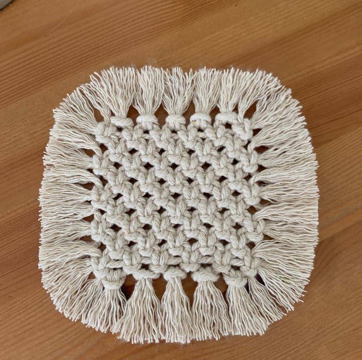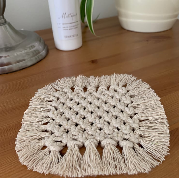 Square Macramé Coaster made with 3mm natural cotton cord. A lovely addition for a bedside table, coffee table or occasional table. This piece has a small fringe on all sides.