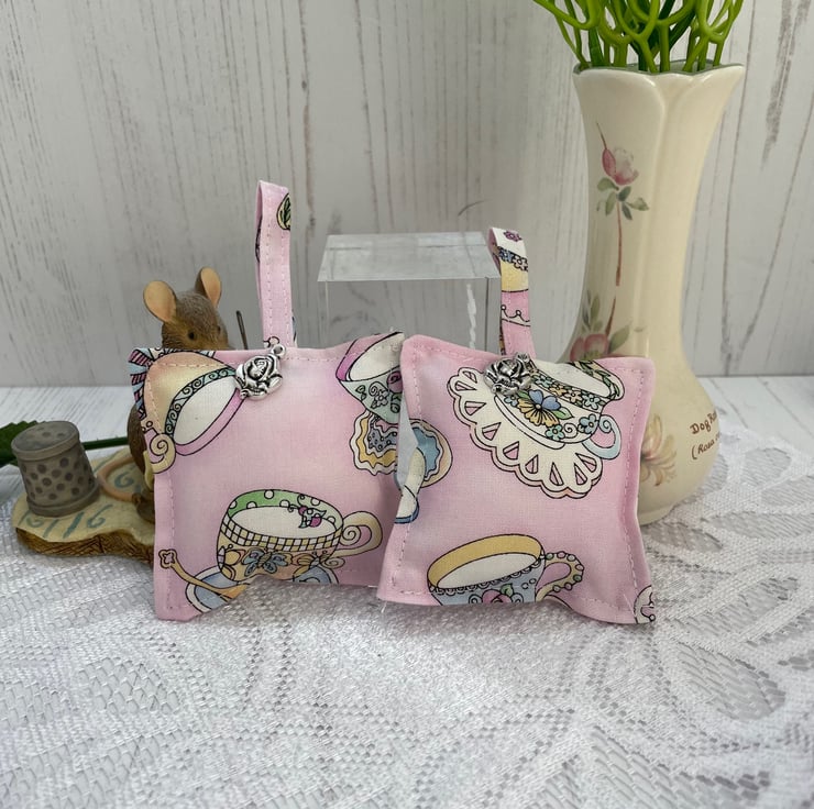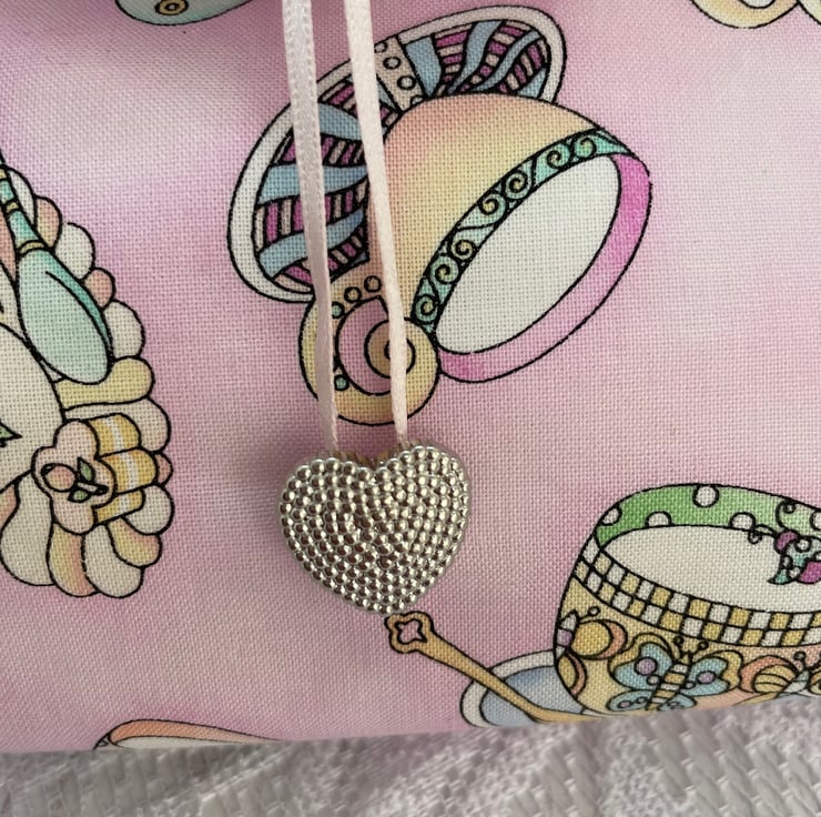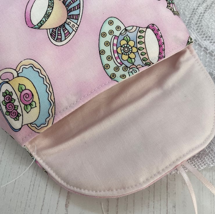 Tea cup print cotton fabric. Lined with pink cotton fabric. Silver heart button to secure shut with pink ribbon loop.