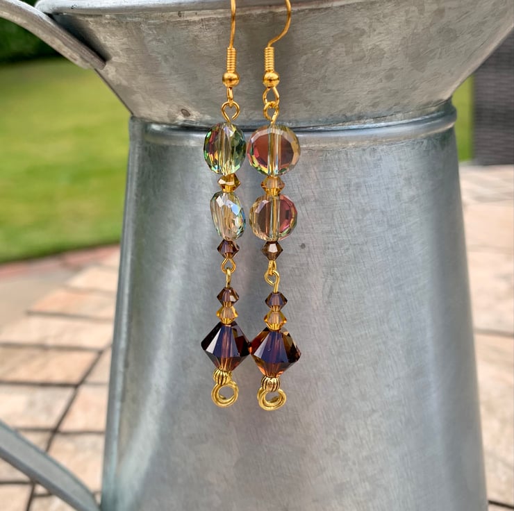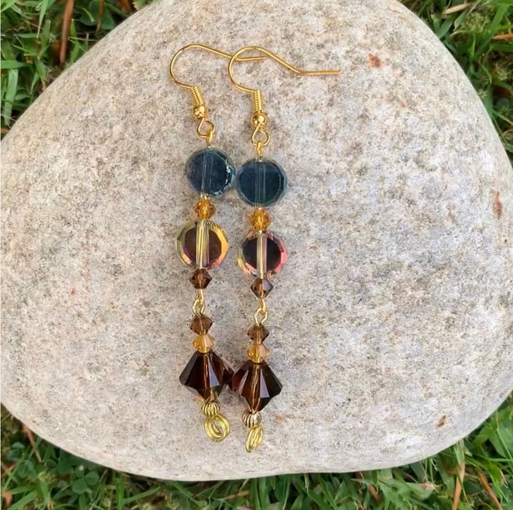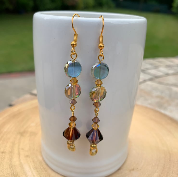 Glistening Czech Crystal coin earrings, featuring beautiful quality and clarity crystals in golden, blue-green, amber and chocolate bronze. Gold plated findings and ear hooks. These iridescent crystals change colours in different lights, and are fabulously eye catching, with a vintage vibe. Approx 6.5cm drop.