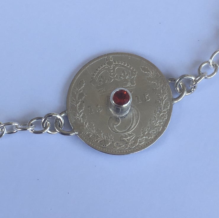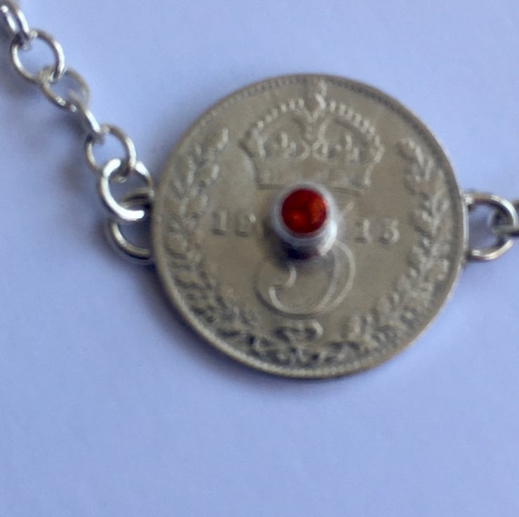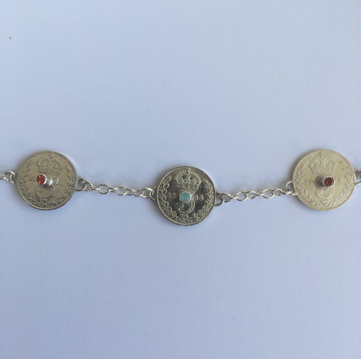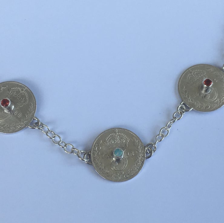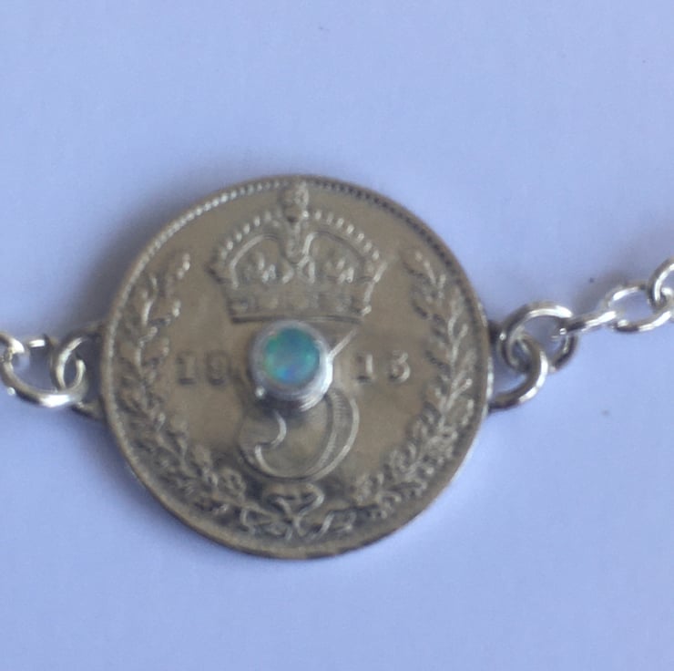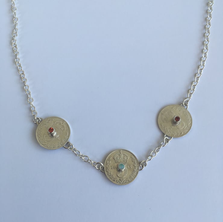 This stunning necklace has three Threepence coins each with the date of 1915, they have been hand set with two beautiful Fire opals and one Opal which reflects blues. The substantial Sterling silver chain is a 3mm trace chain and coordinates with the bracelets . The chain has connections at 43 and 54 cm which makes it wearable with any neckline.