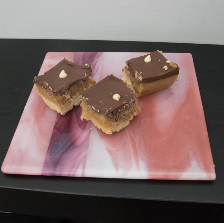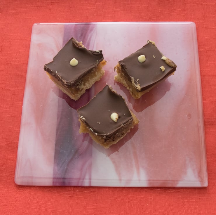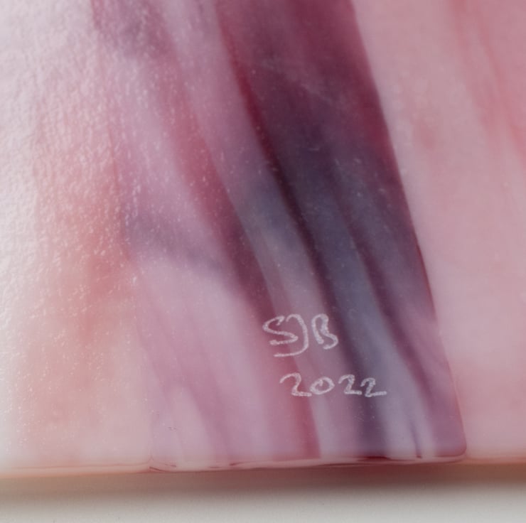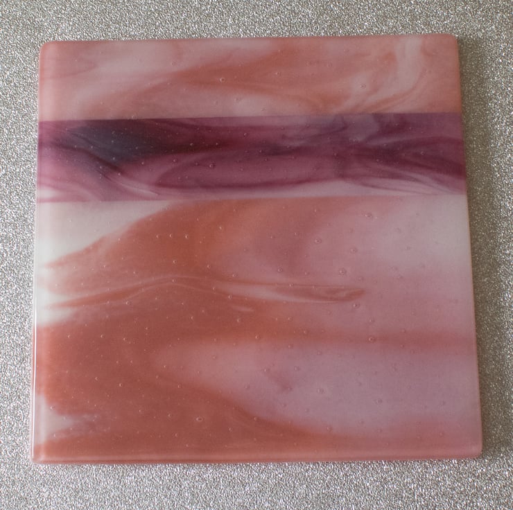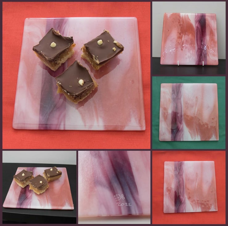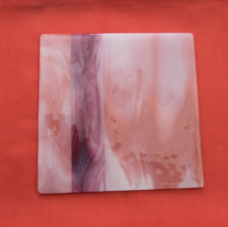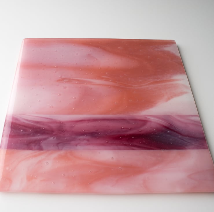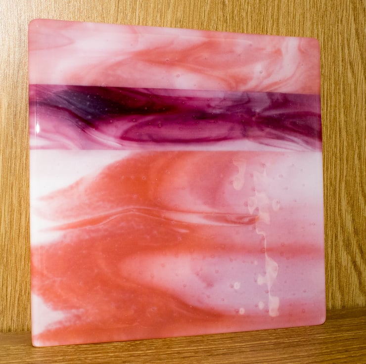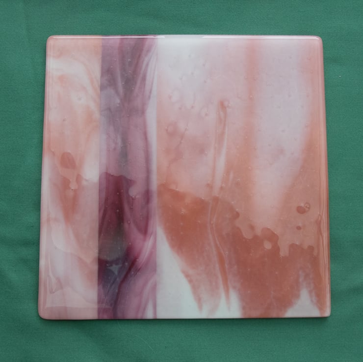 The 20 cm square plate is made from 4 pieces of glass - The base made from 2 pieces of streaky Salmon Pink glass with a stripe of streaky Cranberry Red glass fitted in between. The whole base is capped by a piece of clear glass. The piece is baked at around 800 C in the kiln. The kiln controls the heating and cooling, ensuring that all stresses are removed from the glass, making it safe and strong for you. A second session in the kiln on a mould gives the piece its shape.