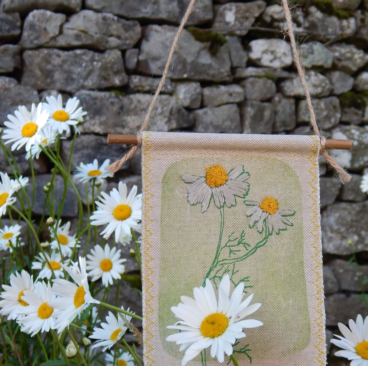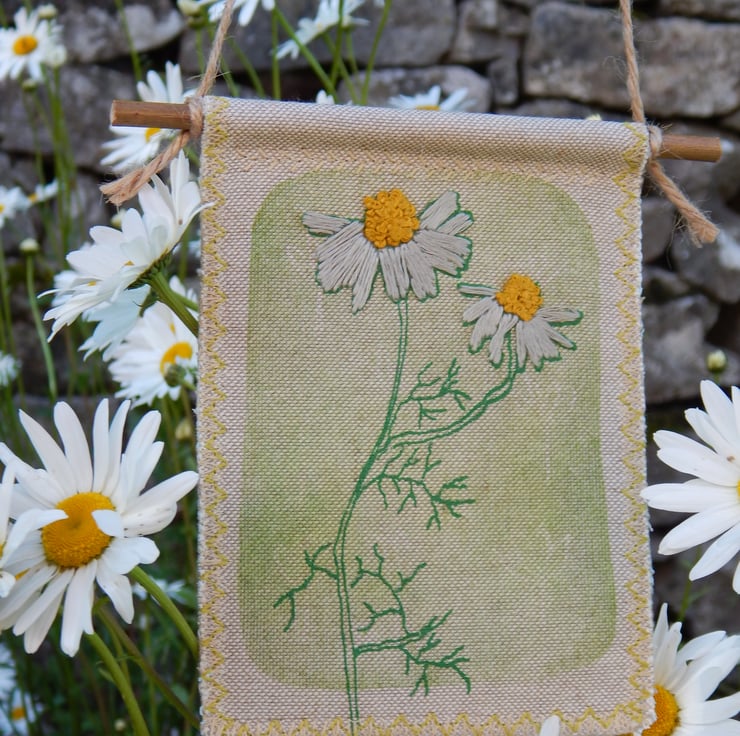 This is a screen printed chamomile daisy on a simple green lino print background. The daisy has been hand embroidered on its petals to make it pop with colour. This piece has a couple of layers of cotton fabric for some stability and this is sewn onto a piece of willow, a simple hanging loop is made with a piece of hemp string connected from one end of the willow to the other.