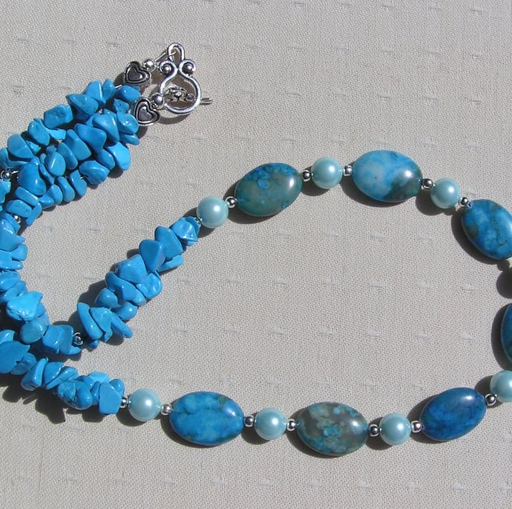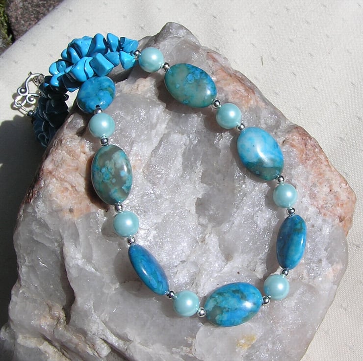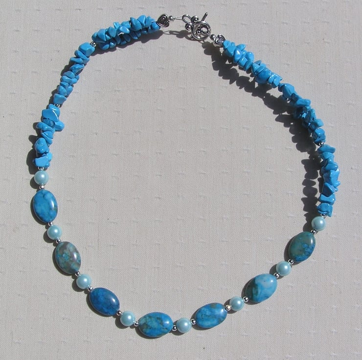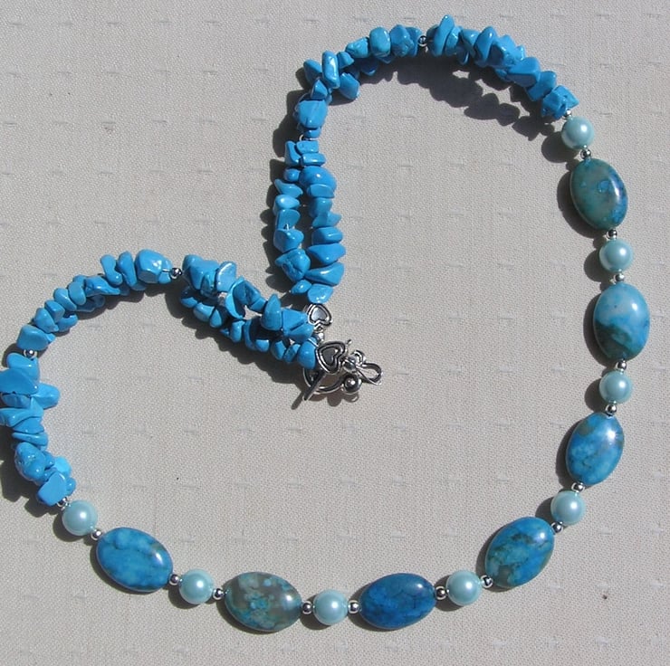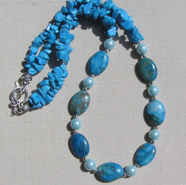 This Stunning Sumptuous Necklace is made from Oval shaped Blue Crazy Lace Agate Beads alternated with Turquoise Shell Pearl round Beads with double stranded Blue Howlite Gem Chips and for that added bit of sparkle tiny Silver spacer beads - a Gorgeous blend of Turquoise shades yet striking combination that will look stunning either worn casually or with something more Elegant for a Special Evening out