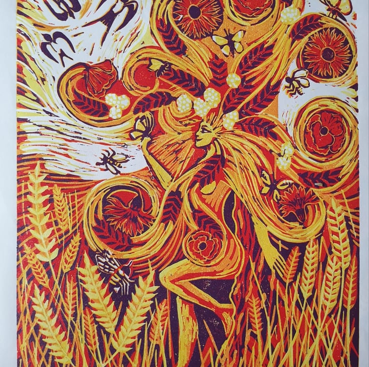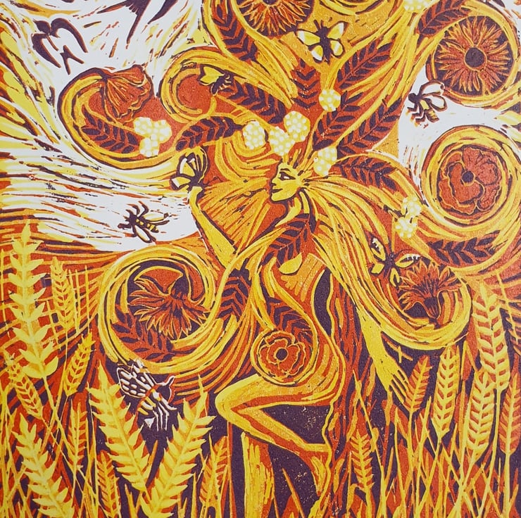 Demeter, goddess of grain, the harvest and the fertility of the Earth. Reduction linocut print 20cm x 27cm. Bees, butterflies, swallows, birds, corn flowers, poppies, nature, pagan, wiccan, turning of the wheel, spring into summer.