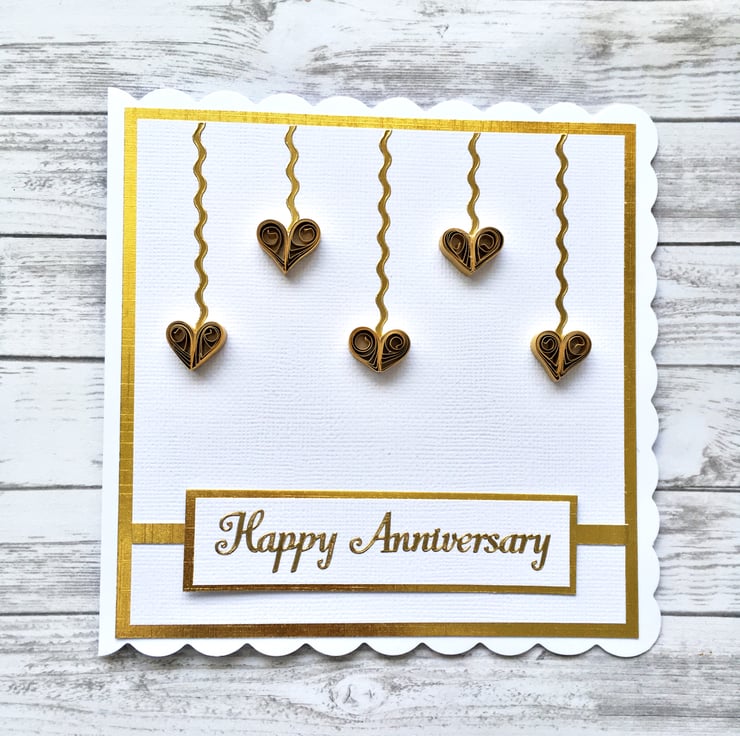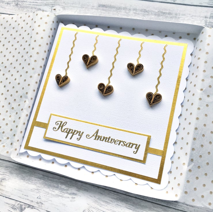 This beautiful Wedding Anniversary card features five hand-quilled gold hearts hanging from gold-foiled “strings” and is perfect for any Anniversary especially a Golden Wedding. A gift box can also be added for that special touch.
