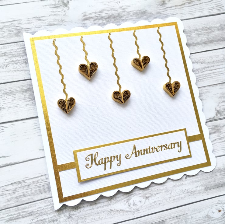 Golden Anniversary card, Golden Wedding - quilled hearts - boxed option