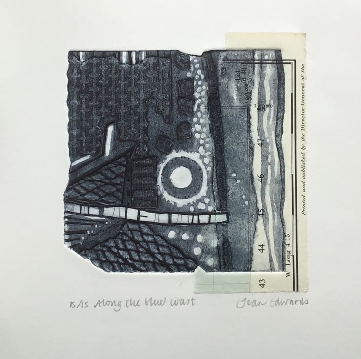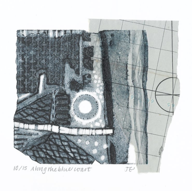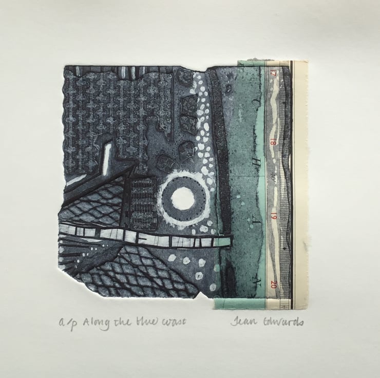 As I was making the plate for this print I was listening to a play on the radio about the sea and that seeped into my imagination and my hands as I played with paper, glue and wallpaper.