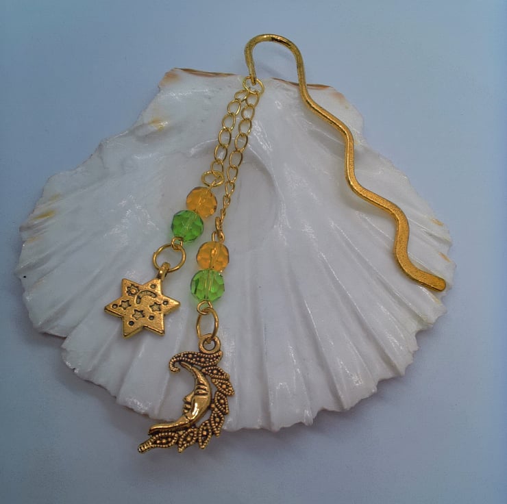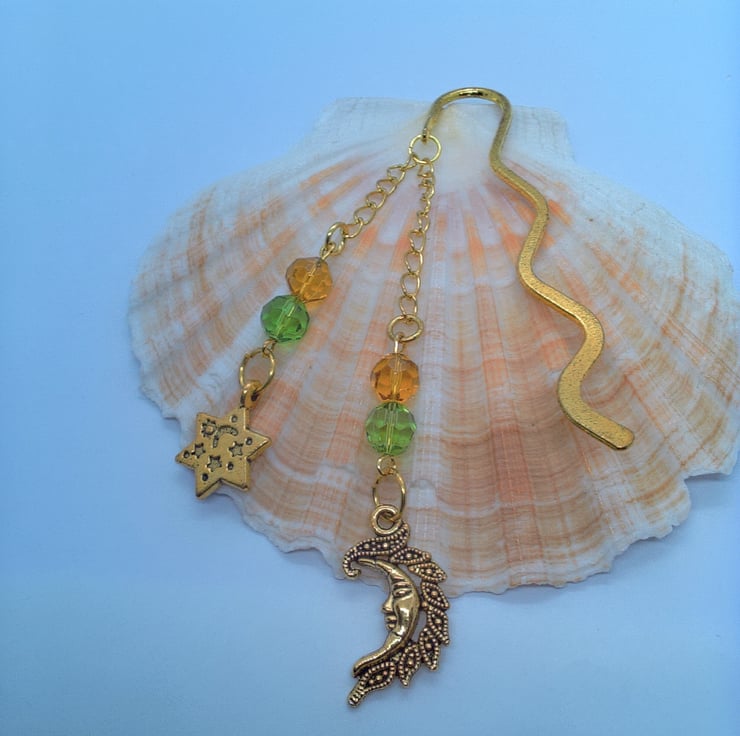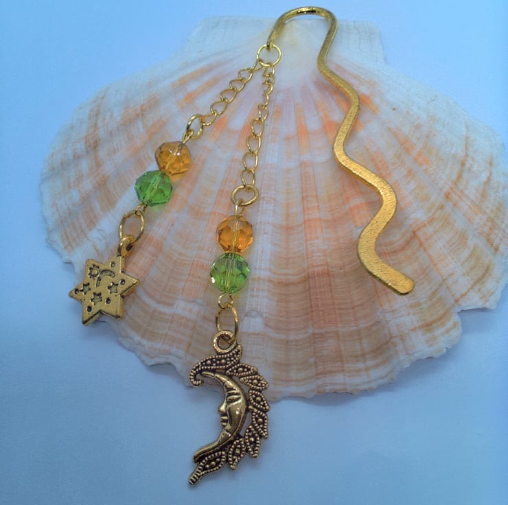 This pretty and practical gold plated bookmark would make an ideal gift for any book lover that you know, or a treat for yourself. It is gold plated and in the shape of a squiggle and it has gold plated moon and star charms and lime and lemon 8 mm round faceted crystal beads. These are suspended from 2 gold plated chains. The charms are attached to 2 pieces of chain 85 mm and 25 mm in length. The Bookmark is 8 cm in length. The bookmark will be dispatched wrapped in tissue paper in an organza bag and delivered to you via Royal Mail first class post.