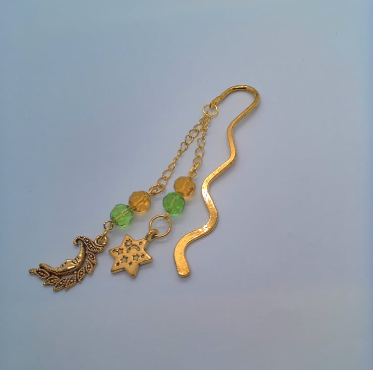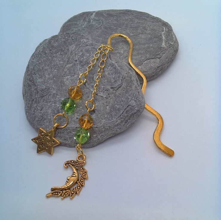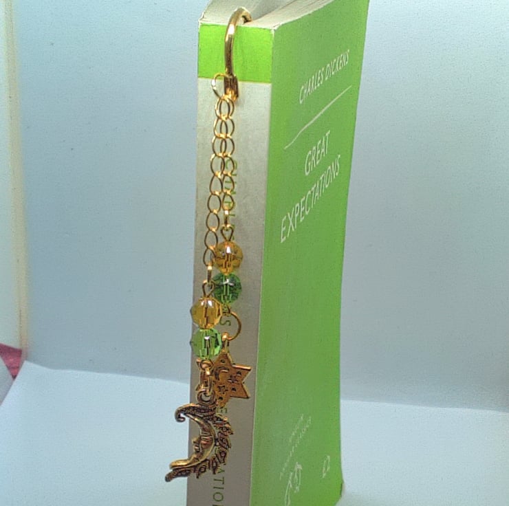 Gold Plated Bookmark With Lemon & Lime Beads and Moon and Star Charms, Reading Accessories, Birthday Gift, Teachers Gift, Book Lovers Gift, End of Term Gift, Green Bookmark, Lampwork Bead Bookmark, Crystal Bookmark