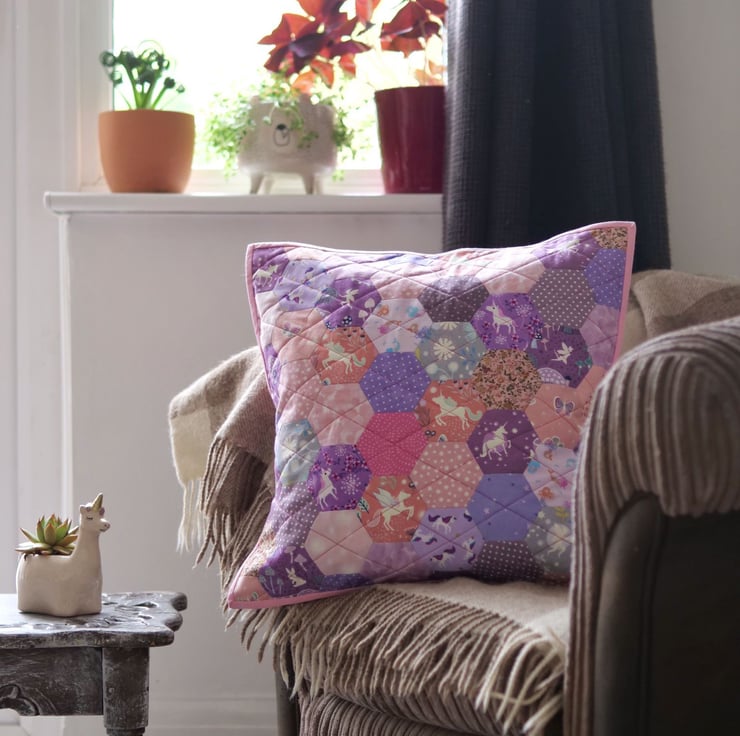 Quilted English Paper Piecing Cushion Cover made from 56 hexagons. Very cute with unicorns and fairies. And they glow in the dark. Fits the standard cushions 43cm x 43 cm. ( cushion is not included ).
