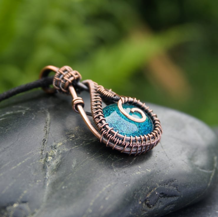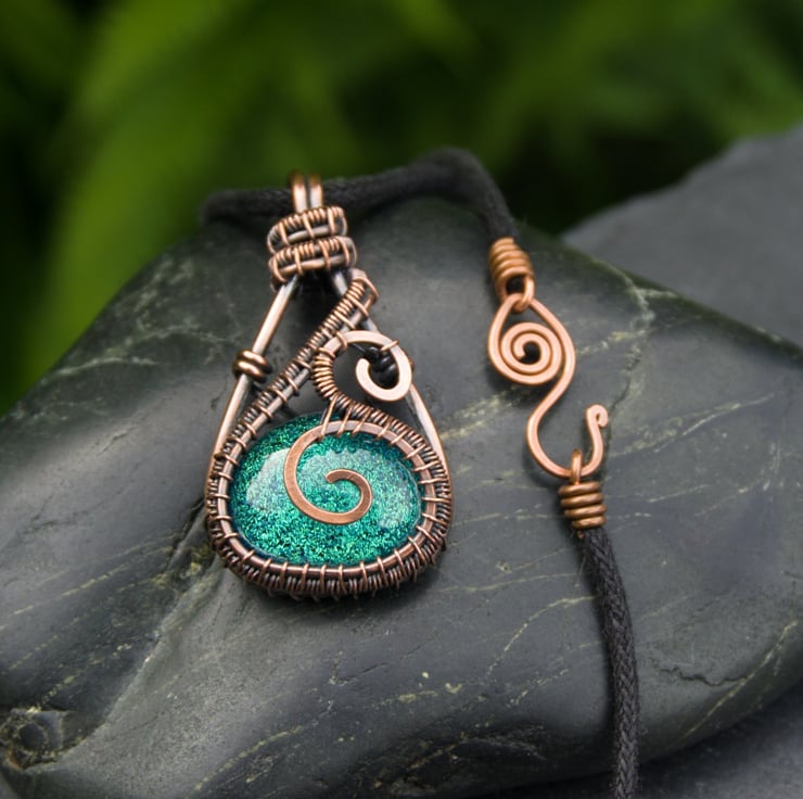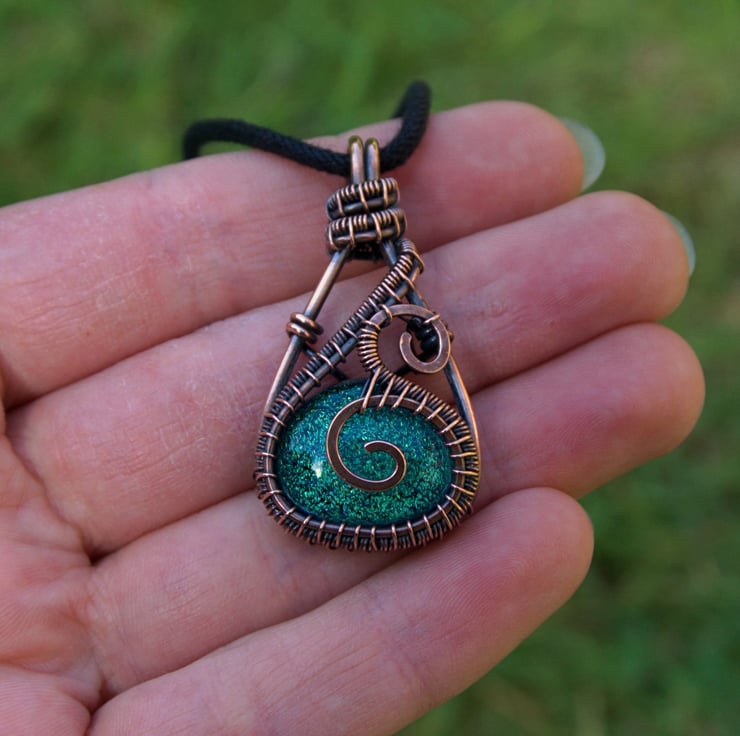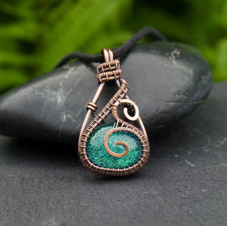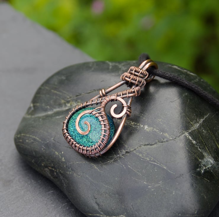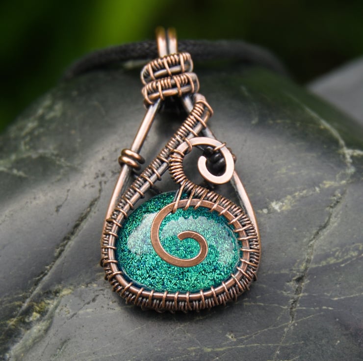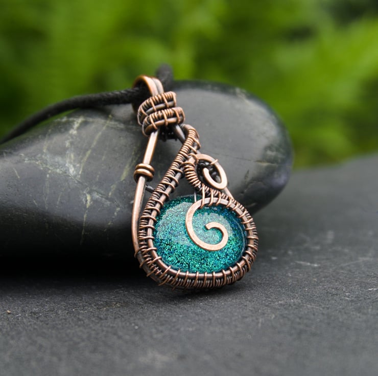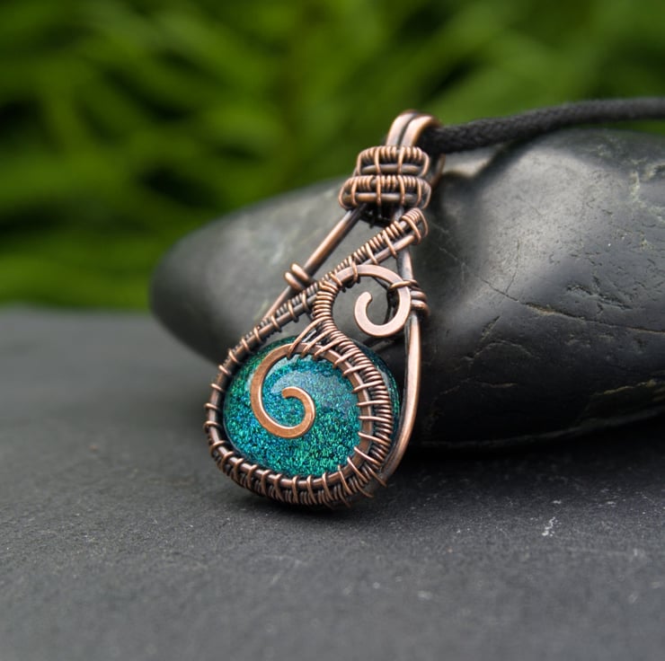 This beautifully unusual pendant has been handcrafted from copper wire and features a stunning green dichroic glass pebble. Thick copper wire forms the teardrop shape, with the oval green glass sitting in the bottom of the drop. Finer wires have been woven together and around the gorgeous green glass, before splitting to form two spiral details across the front of the pendant. These spirals are hammered flat for a pretty contrast to the woven wires.