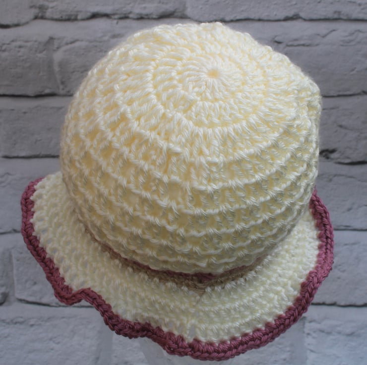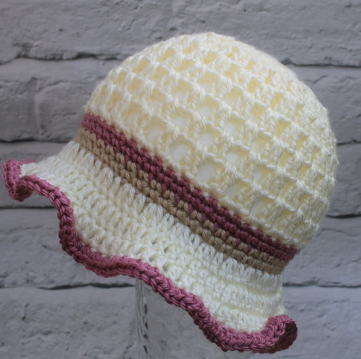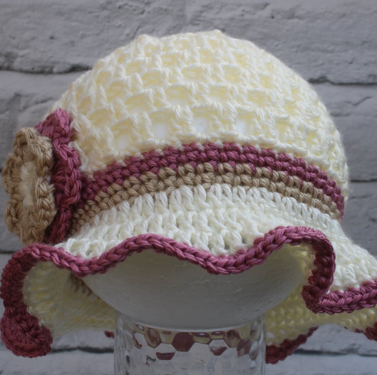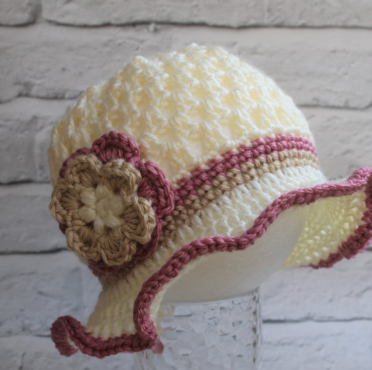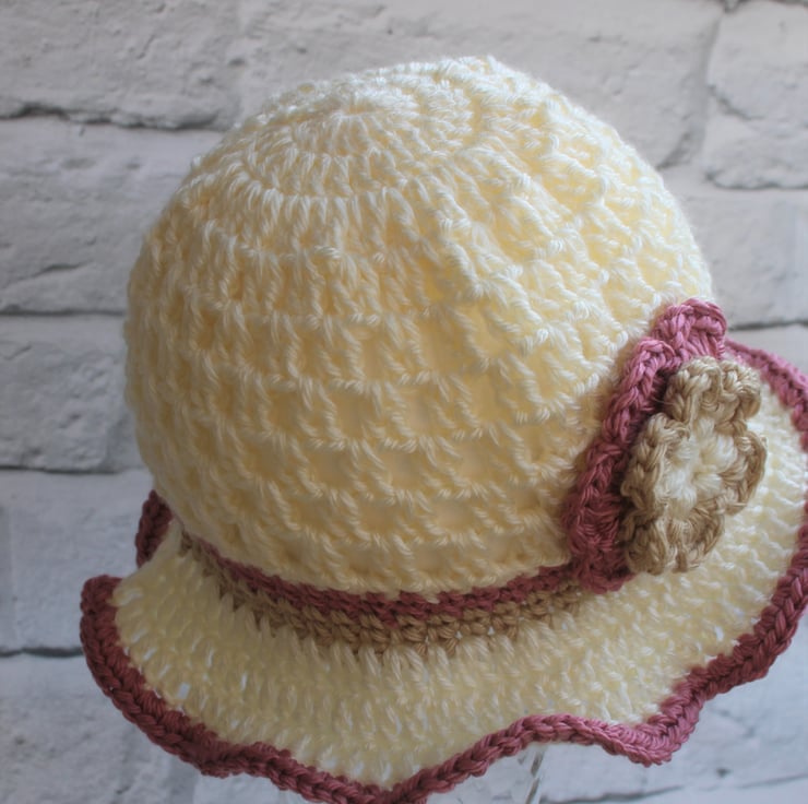 Hat is cream in colour with a beige and dusty rose band and flower.