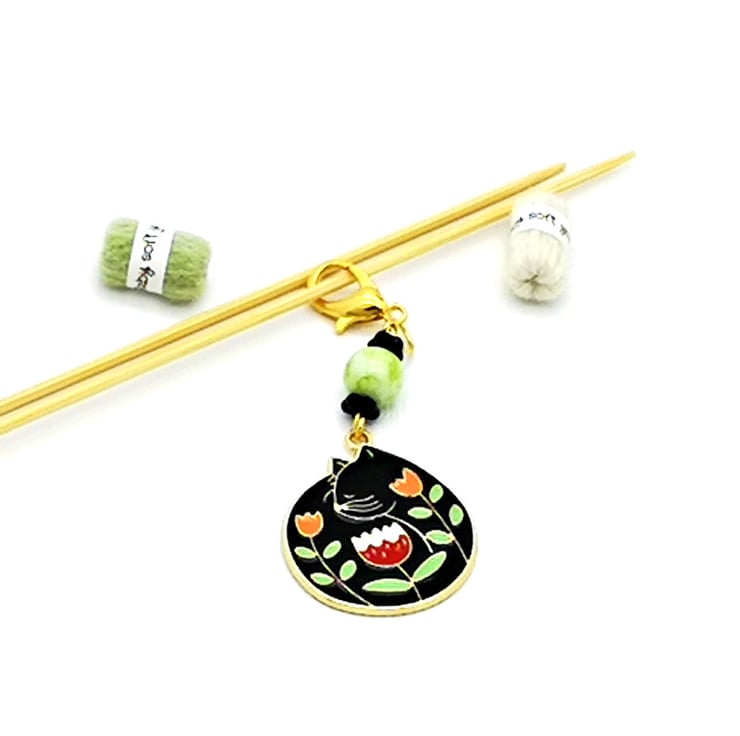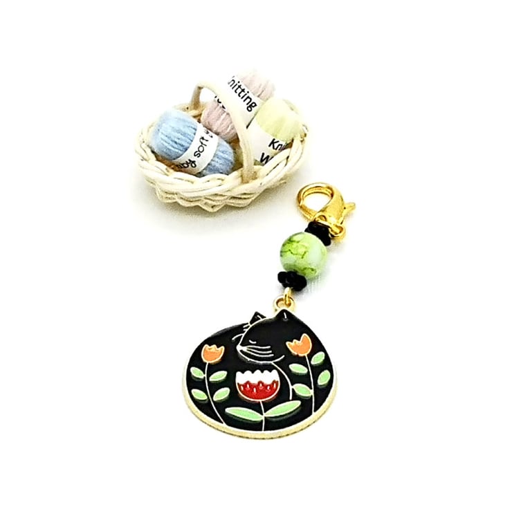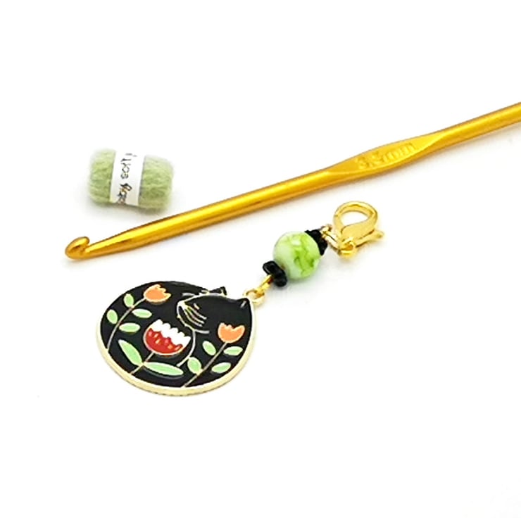 Black Cat stitch marker with gorgeous vibrant flower detail, a green marbled glass bead with black daisy spacer beads add a lovely finishing touch. Perfect for all your knitting and crochet projects.