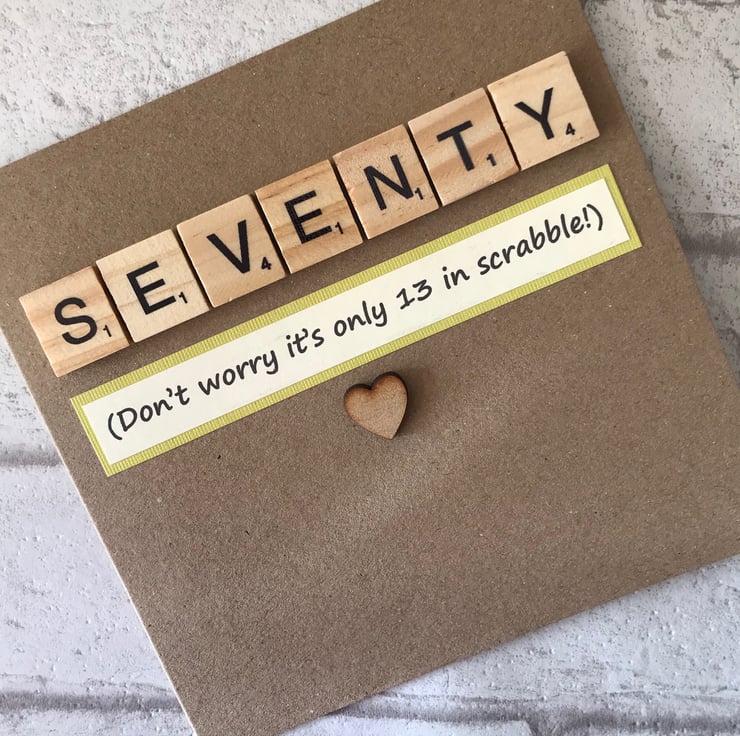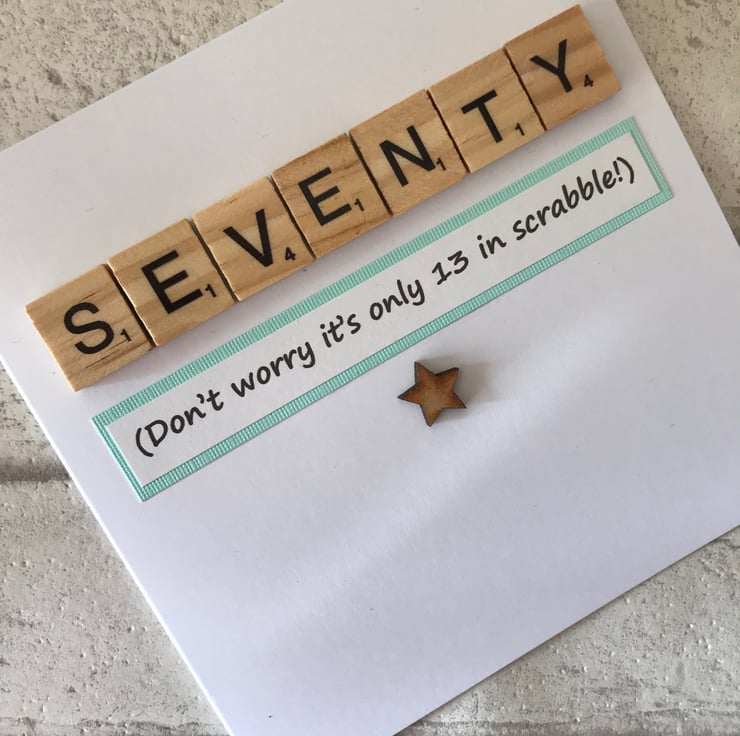 A printed greeting is added which states that SEVENTY is actually only 13 in scrabble and the inside is left blank for your own message. .