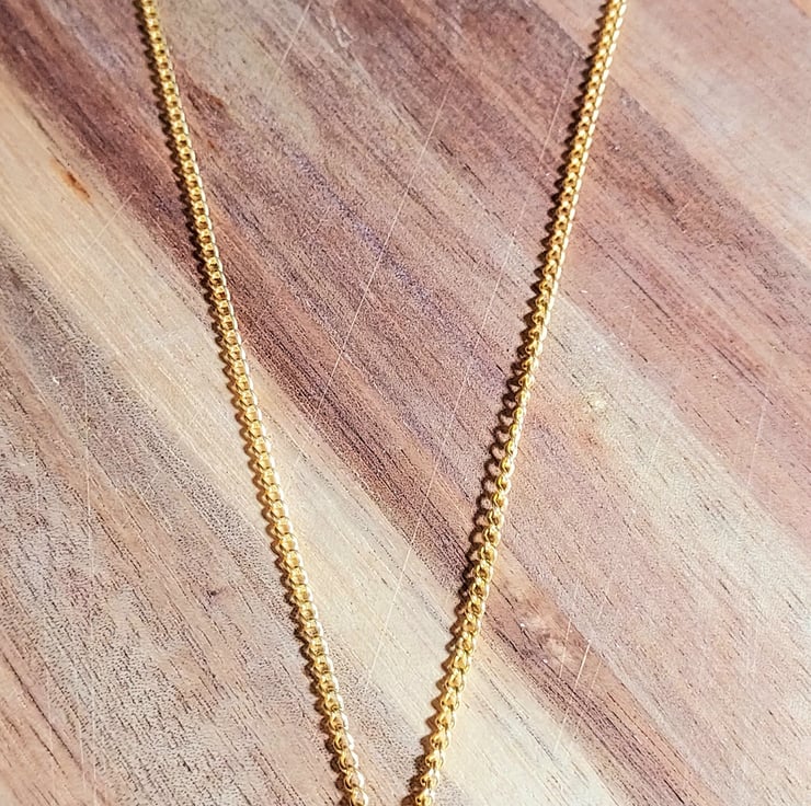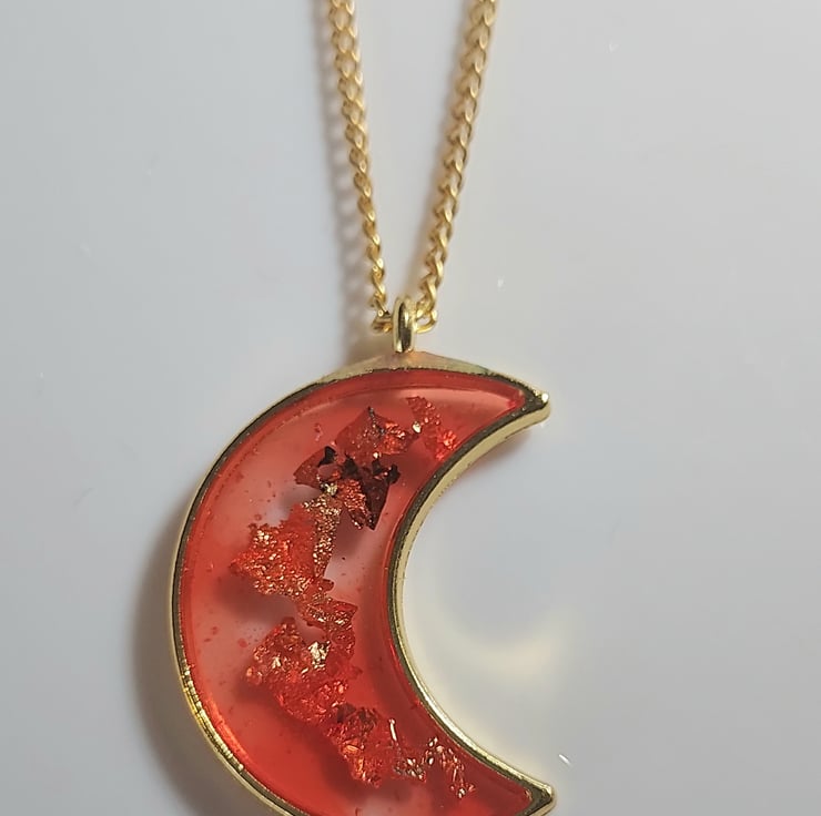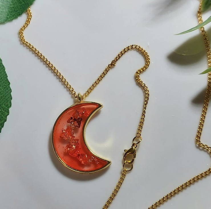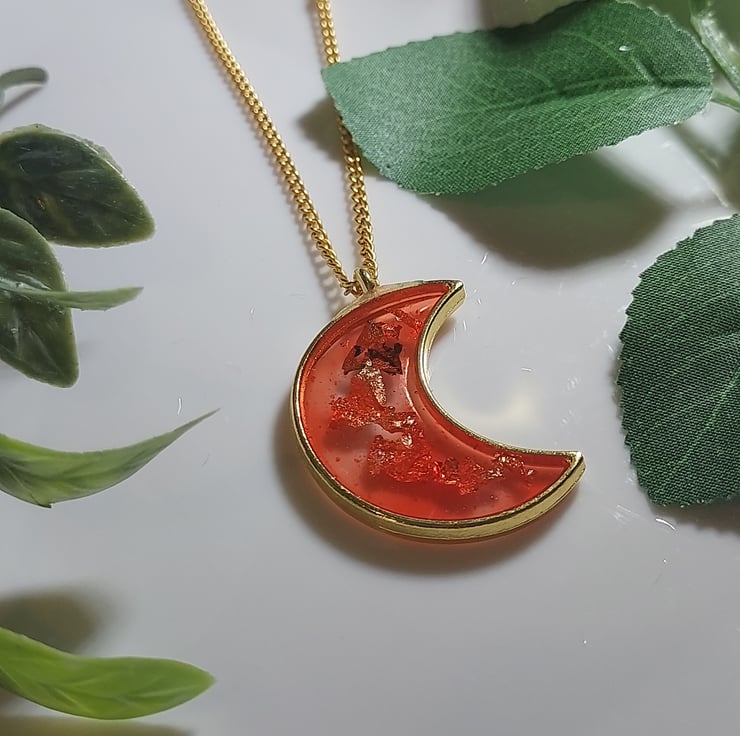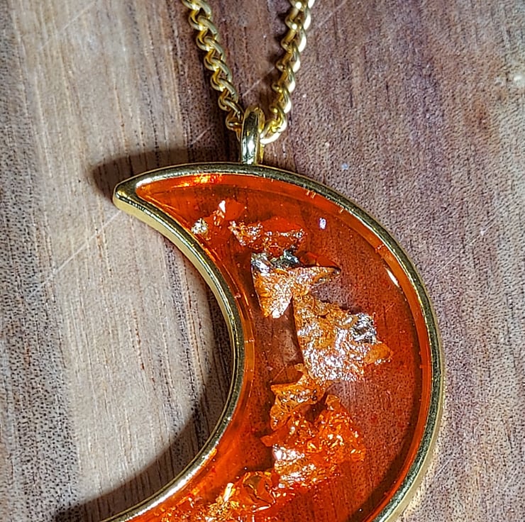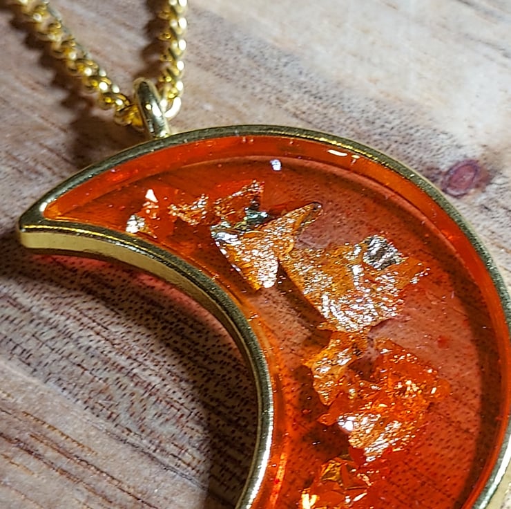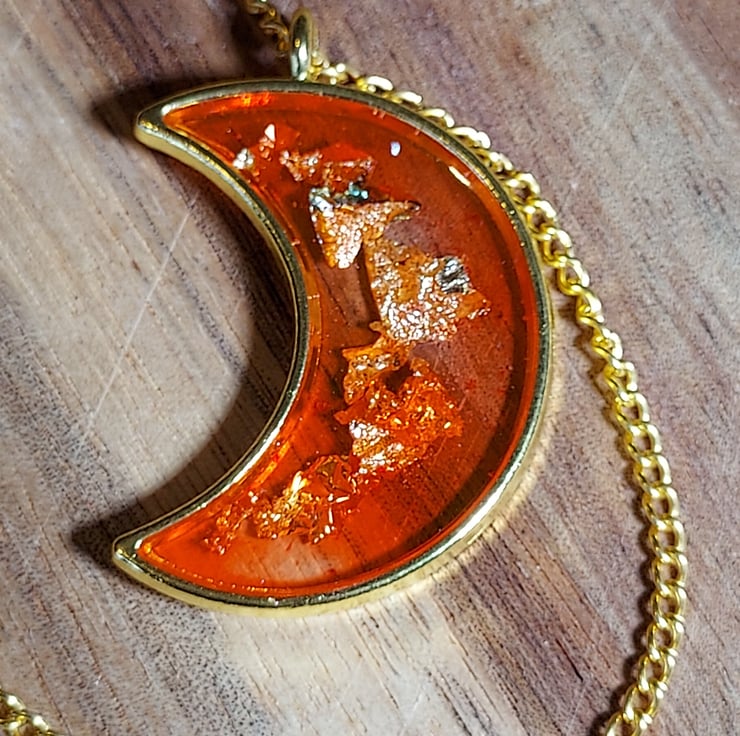 This moon shaped pendant necklace measures 1 and a half inches long ( 3.5 cm). It is made from a richly coloured orange resin, with a vein of gold toned metallic flakes running through it. The resin is held in a gold toned open - backed bezel, allowing light to shine through. The pendant is hung on a gold coloured metal chain 18 " ( 45.5cm) long. it comes presented in a smart little black box and a pretty organza gift bag.