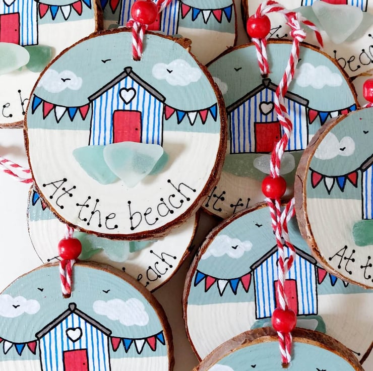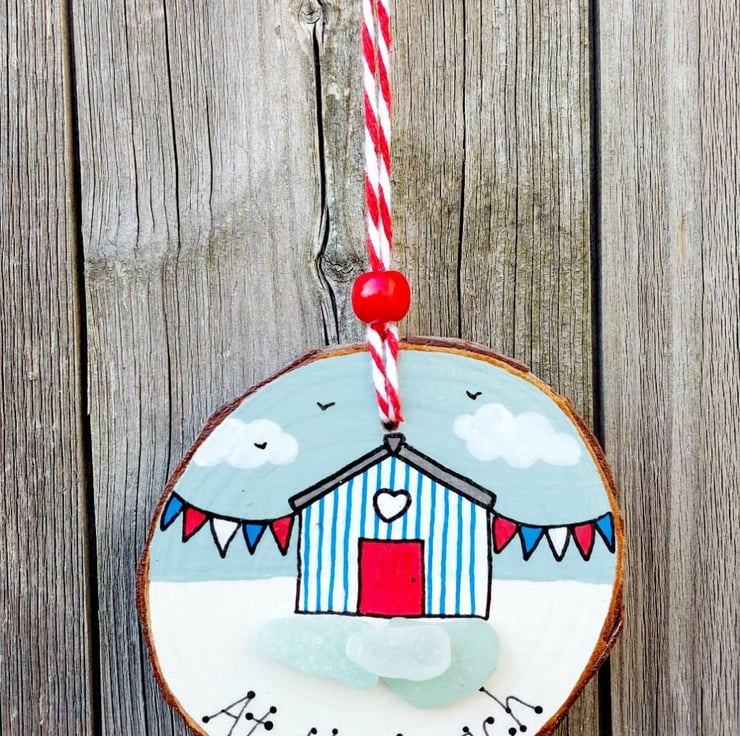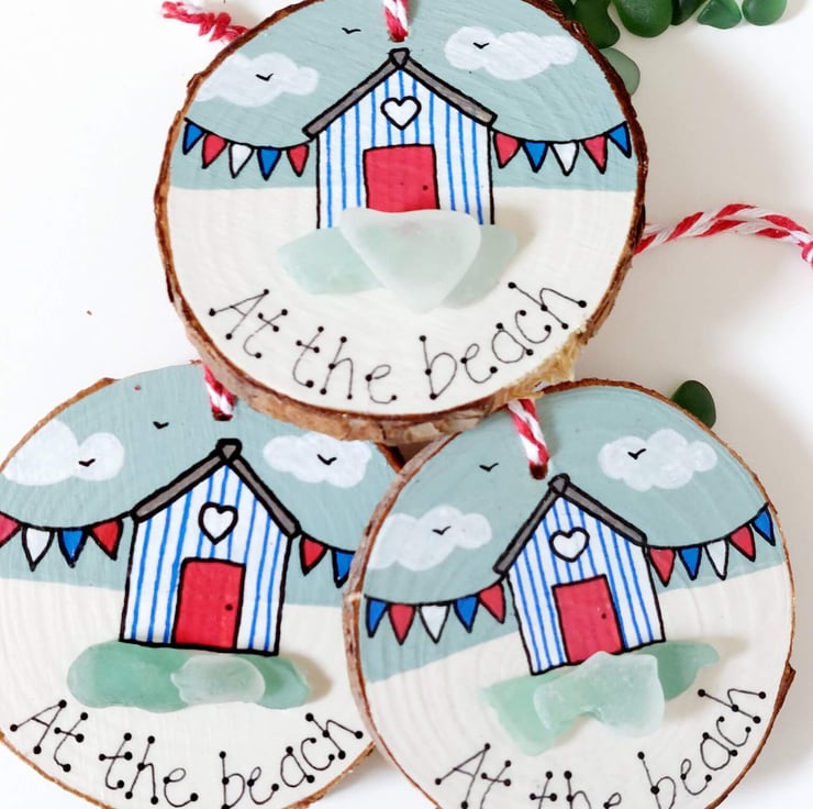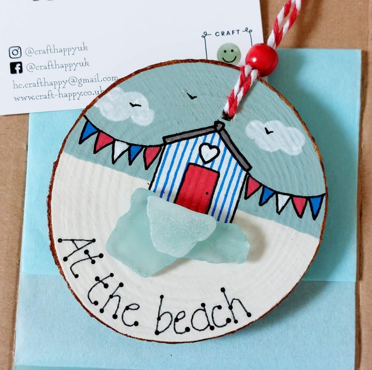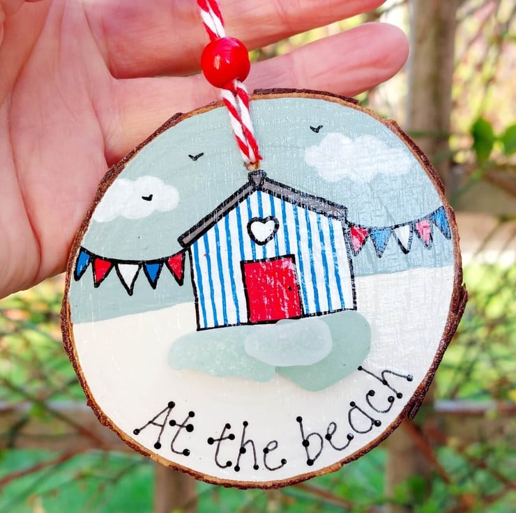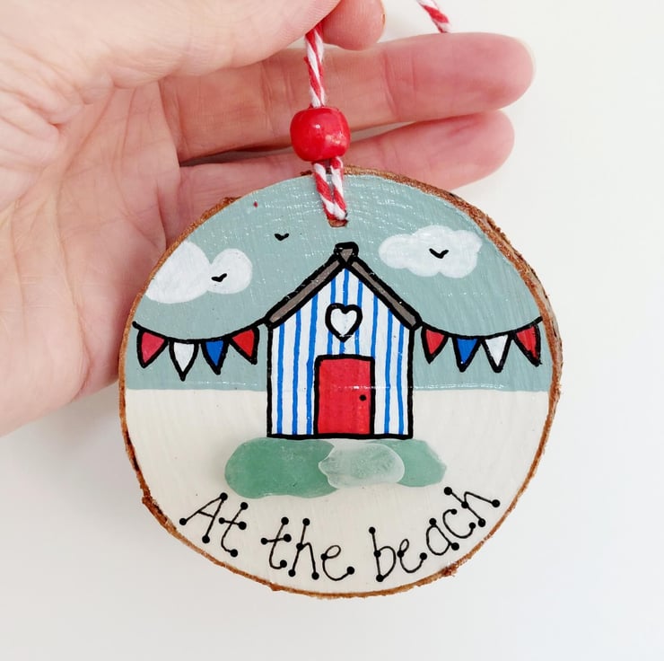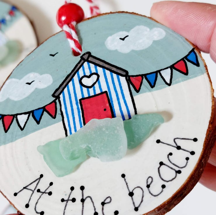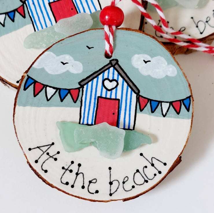 Each of these decorations are individually made using sea glass and hand painted details showing a quirky little beach hut with the words 'At the beach' underneath. The sea glass has been collected on my beachy travels and the whole piece has been sealed to give it a glossy sheen. This has been finished using butcher's string and a wooden bead in complementary red and is ready to hang in your home, your beach hut, your car or anywhere where it will make you smile and remind you of those hazy summer beachy days.