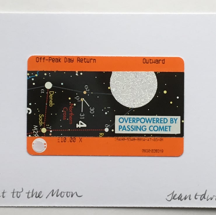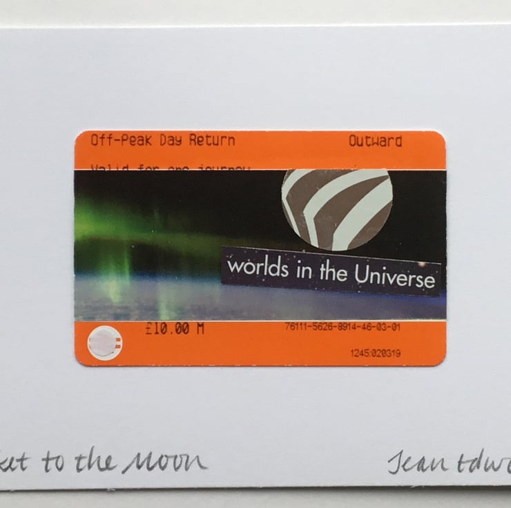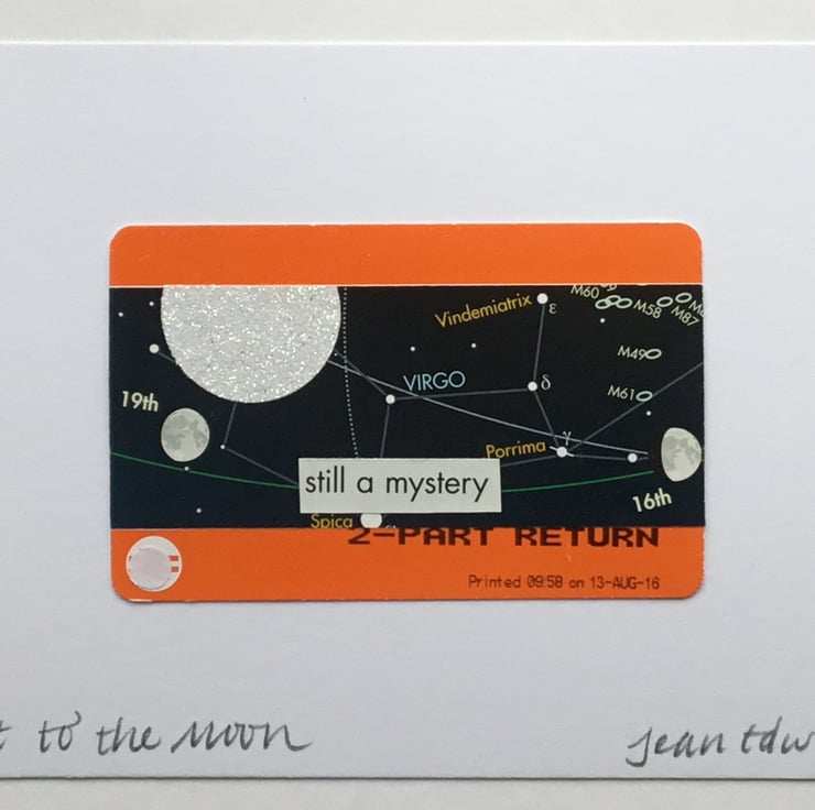 I’ve been collecting and altering UK train tickets for some time now. This one has collage images and text from The Sky at Night magazine.