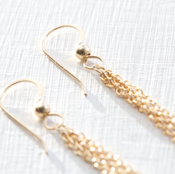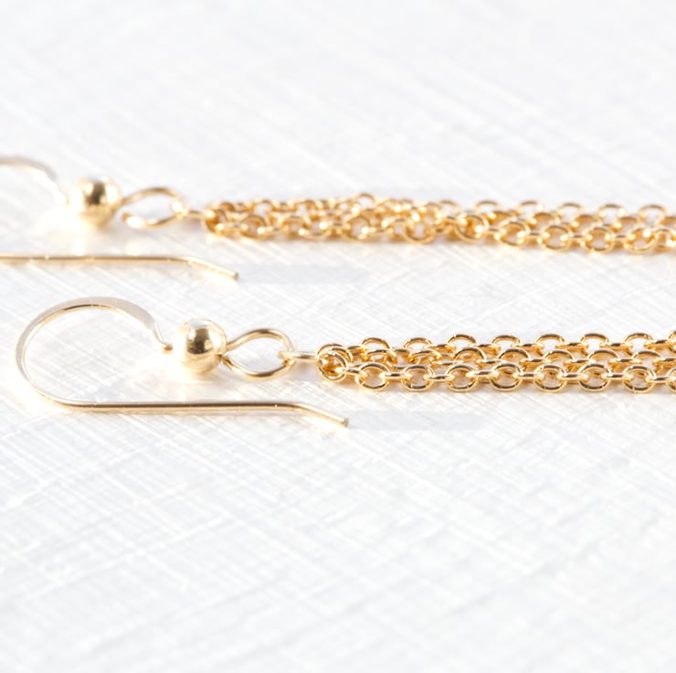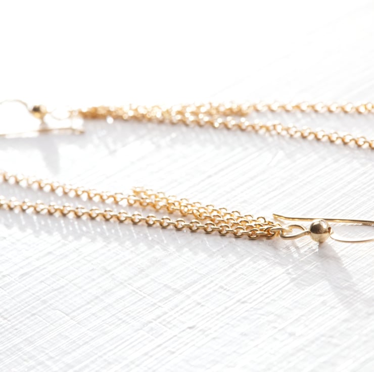 Handmade 14K Gold Filled Triple Chain Drop Earrings are made from 14K Gold Filled Chains ,approximately 70mm (2 1/2 nches) long with Gold Filled 22 Gauge (0.7mm) ear wire. The total length of the earrings measures approximately 85mm (3 1/4 inches).