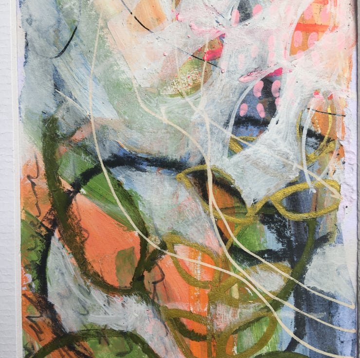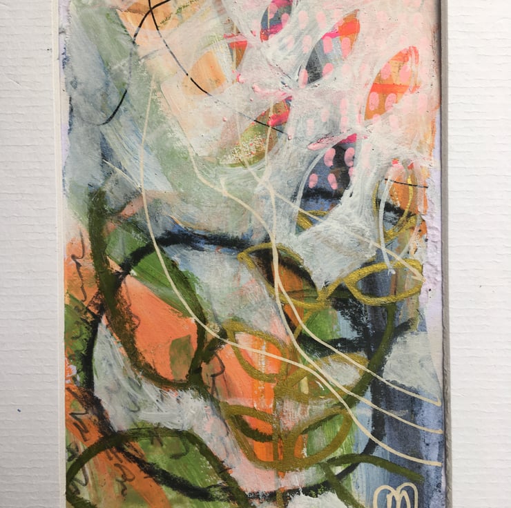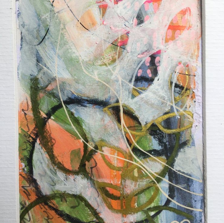 Media;- Mixed media, inc. Acrylic Paint, Ink, Pen, ink, pencil, Pastels. On Paper, in a card Mount.