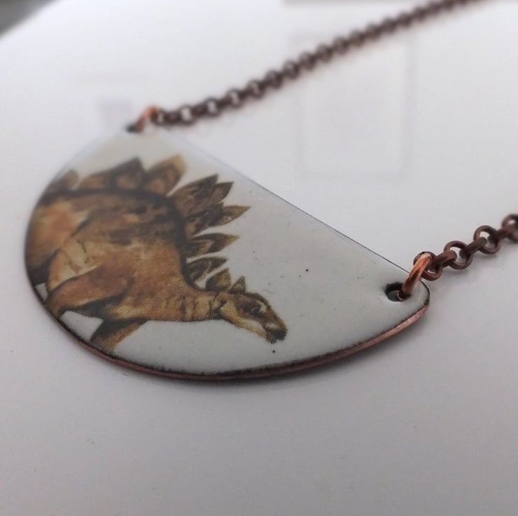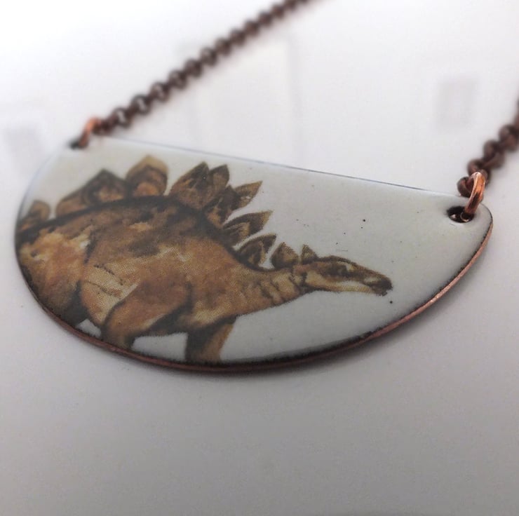 Enamelled copper necklace, with a stegosaurus on an ivory coloured background. The plate measures 55mm across the top and is 30mm deep. It is counter-enamelled on the back and the chain is made of copper-plated steel.