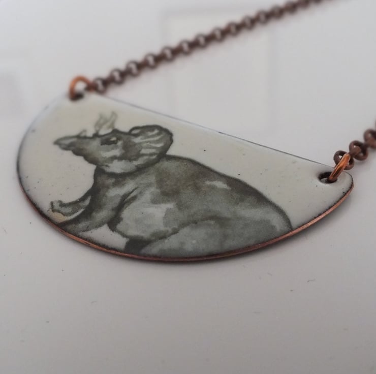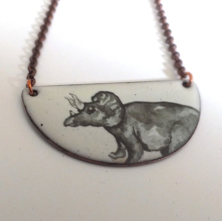 Enamelled copper necklace, with a triceratops on an ivory coloured background. The plate measures 55mm across the top and is 30mm deep. It is counter-enamelled on the back and the chain is made of copper-plated steel.