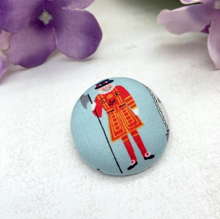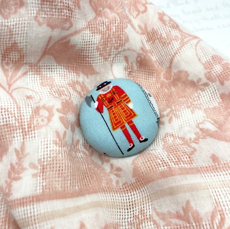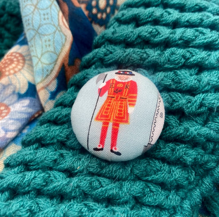 For this lovely brooch I have selected a Yeoman Warder in his eye-catching red uniform,full regalia, like the hat, buckles on his shoes and holding a long-handled axe, standing next to a drawing of the Tower of London (you can just spot it on the right of the brooch). I’ve then made a 38mm diameter fabric covered flat backed button and added some toy filling to the front to create a nice domed effect.
