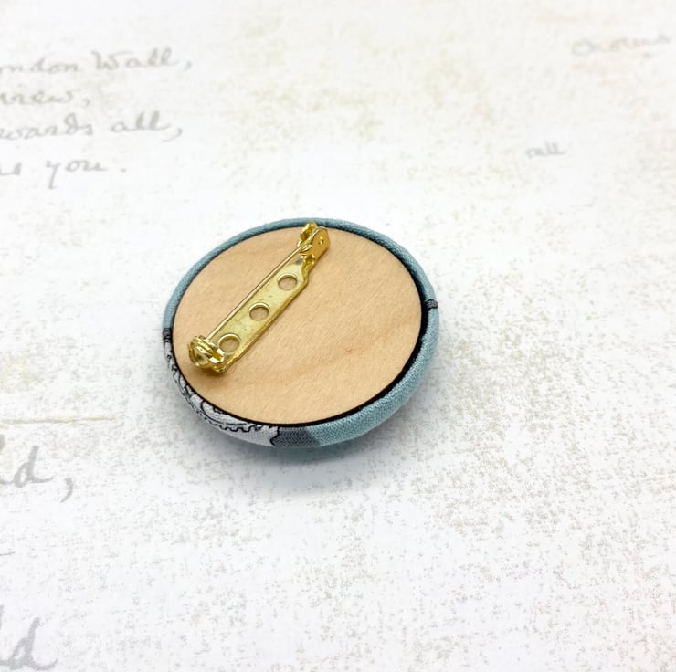 On the back of the button, I have secured a birch plywood (FSC approved) circle, followed by a couple of layers of matte varnish for added protection, leaving the natural grain of the wood to shine through. I've also added a gold plated brooch with safety back.
