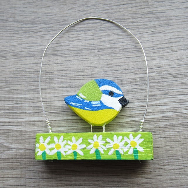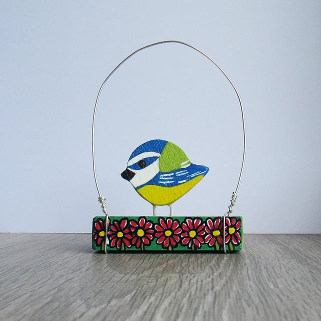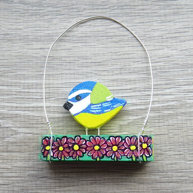 Miniature hand carved and hand painted blue tit ornament. This cute little bird has been hand painted with acrylic paint in yellow, blue, white & green. It perches on a wooden rectangle block which has been painted with a double sided flower design. White daisy like flowers on one side and red flowers on the reverse.