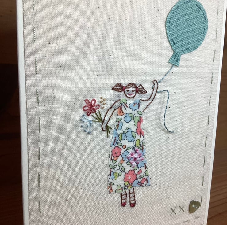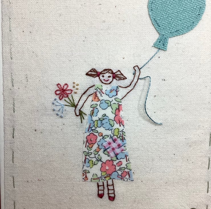 A beautifully made freehand embroidered card featuring a little girl in a Liberty fabric dress holding a posie of flowers and balloon. This card would be perfect to send birthday wishes and could easily be framed to make a lasting keepsake. The card measures C6 (15 x 12.5cm) and is stitched onto calico and backed onto cream card with matching envelope. All of my cards are carefully wrapped in cellophane and tissue paper and sent out within one day of purchase.