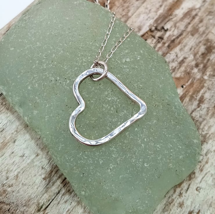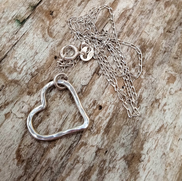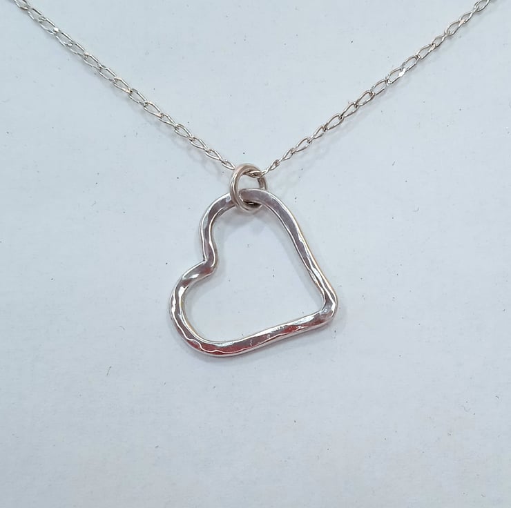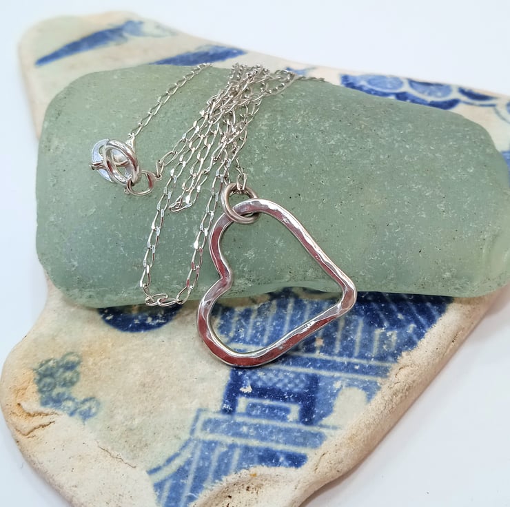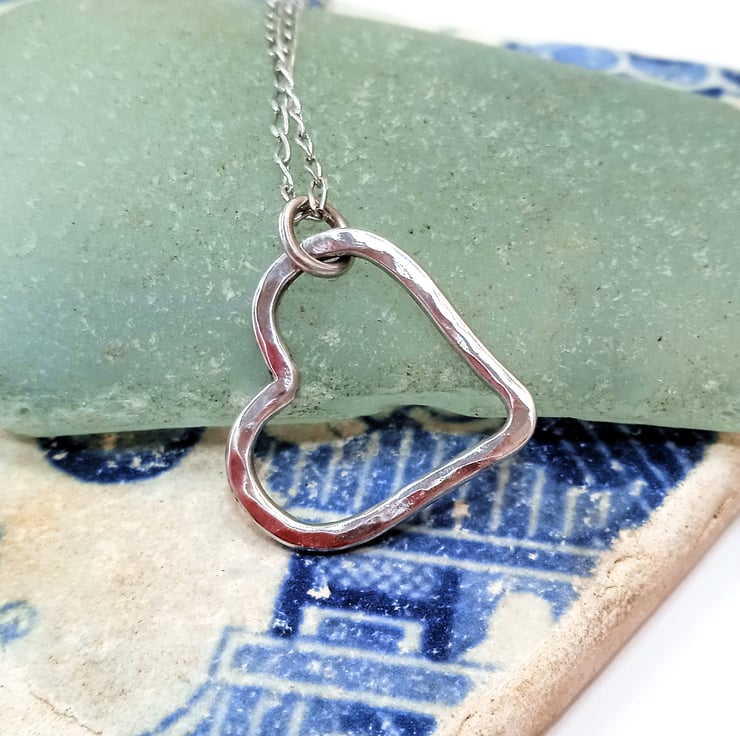 I have given the heart a hammered finish to create an attractive texture on one side and a flatter finish on the other so that it can be worn either way round. I have hung it from a soldered sterling silver jump ring so that it hangs at an angle.