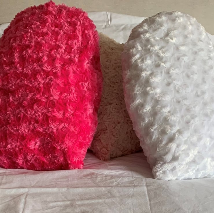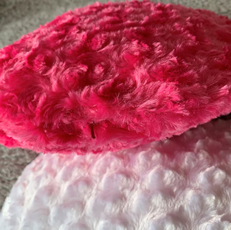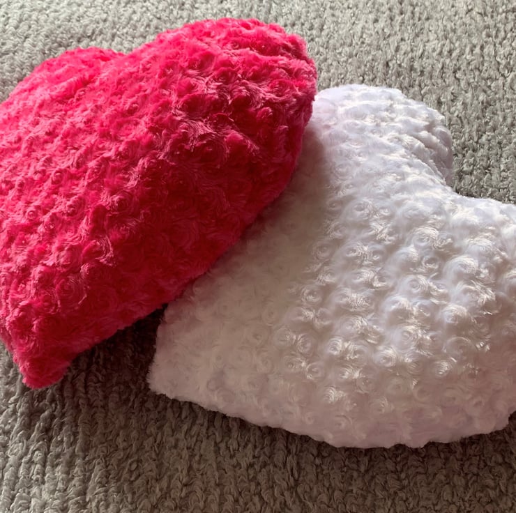 Super soft and tactile fuchsia pink swirled Cuddle Plush fabric with a long 12mm pile giving a rosebud effect surface. Plush is often used for cuddly toys and is gorgeous. The 12mm pile gives this a deluxe feel. A beautiful heart shaped cushion.
