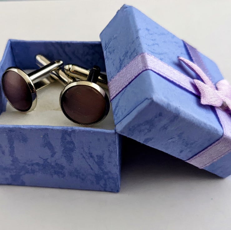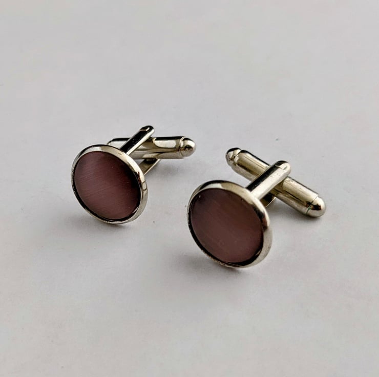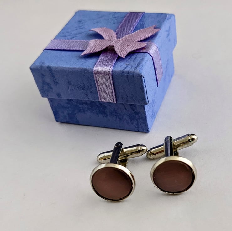 Silver plated cufflinks with 12mm mauve cat's eye (chrysoberyl) cabochons. In a gift box.