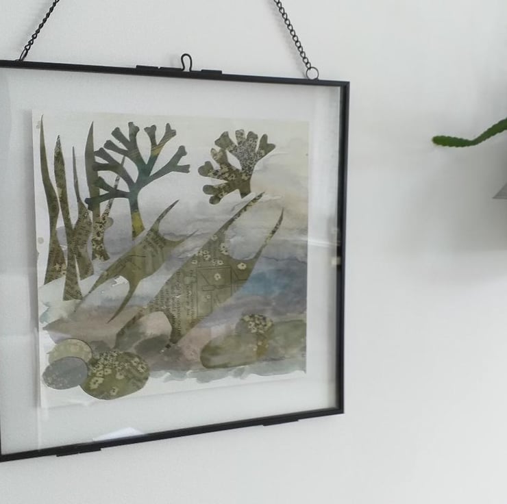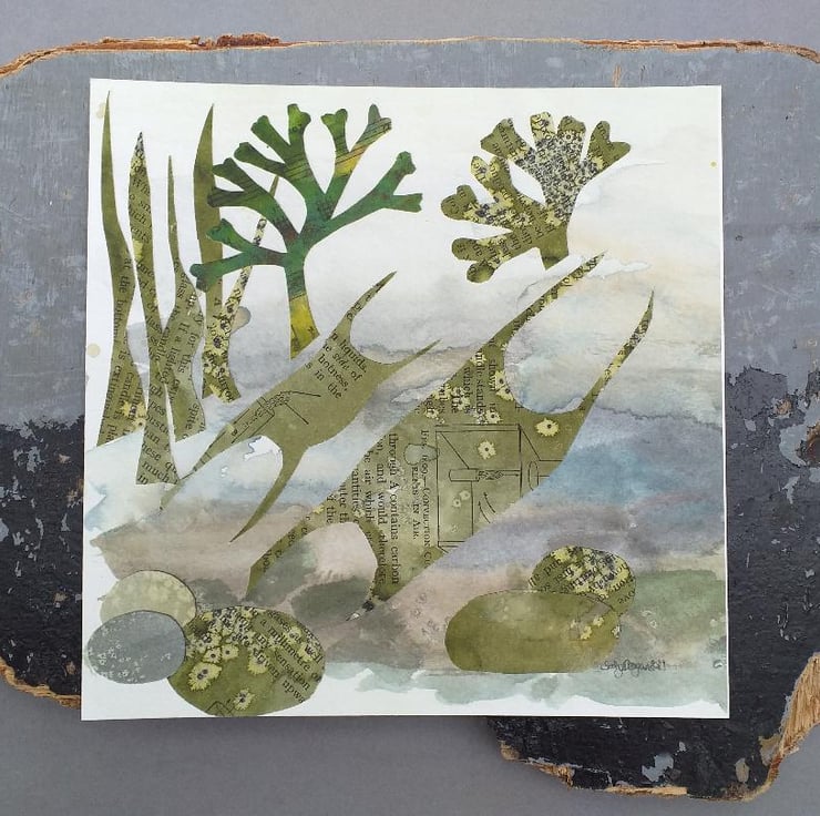 From childhood memories of rockpooling, and the magic of discovering mermaids purses. I love to make use of papers from old textbooks and combine them with inks and watercolour.
