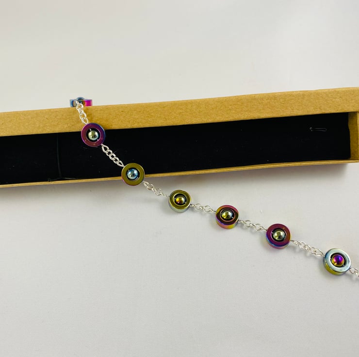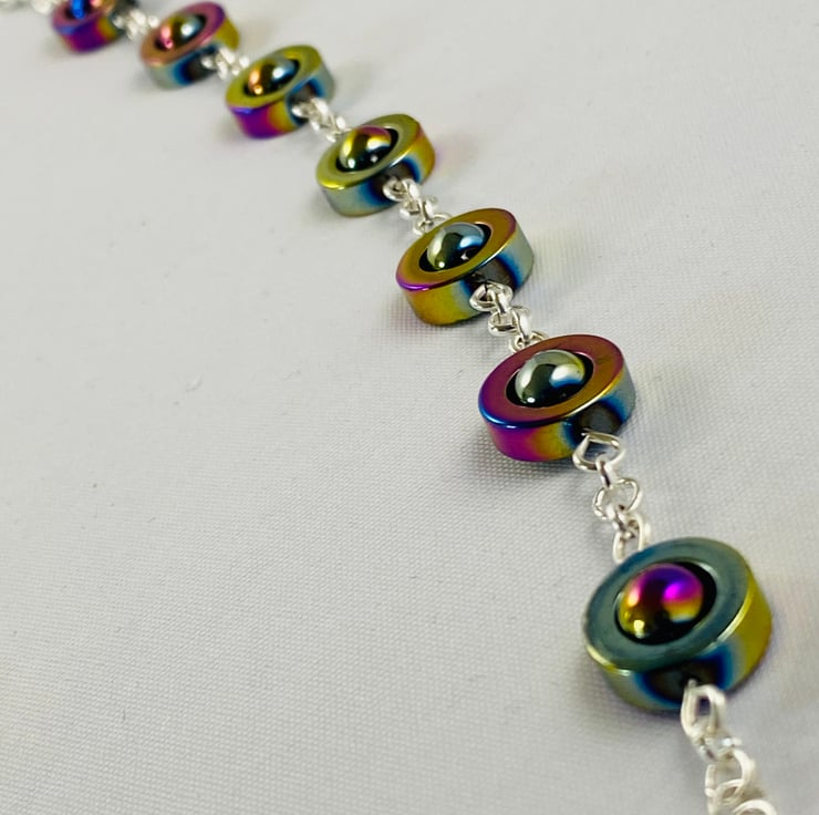 Rainbow hematite beaded bracelet made using rainbow hematite hoop beads with round hematite beads with lobster claw clasp