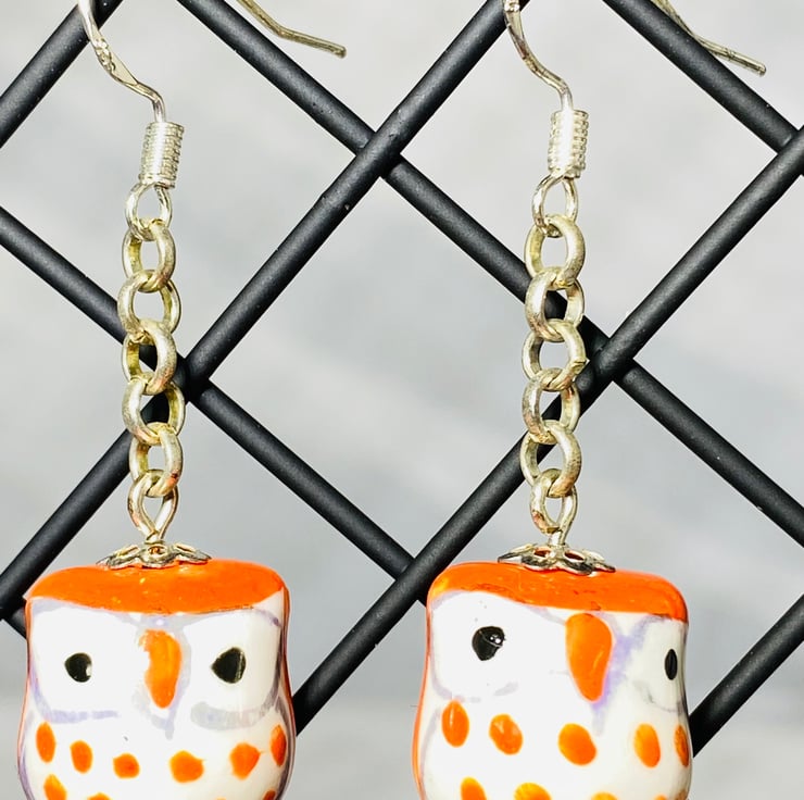 Fun earrings made using hand painted 15mm orange ceramic owls with silver plate bead caps, silver plate chain and 925 silver earring hooks