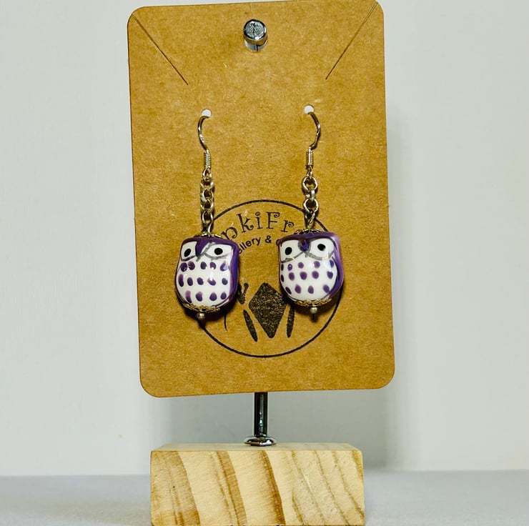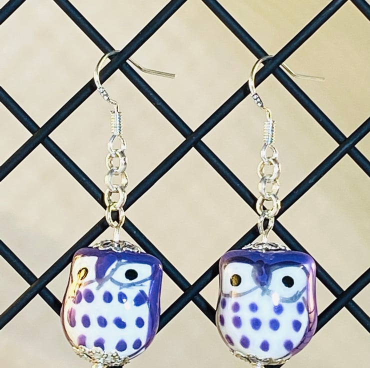 Fun earrings made using 15mm purple ceramic owls with silver plate bead caps, silver plate chain with 925 silver earring hooks