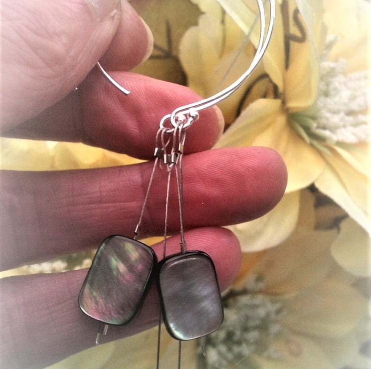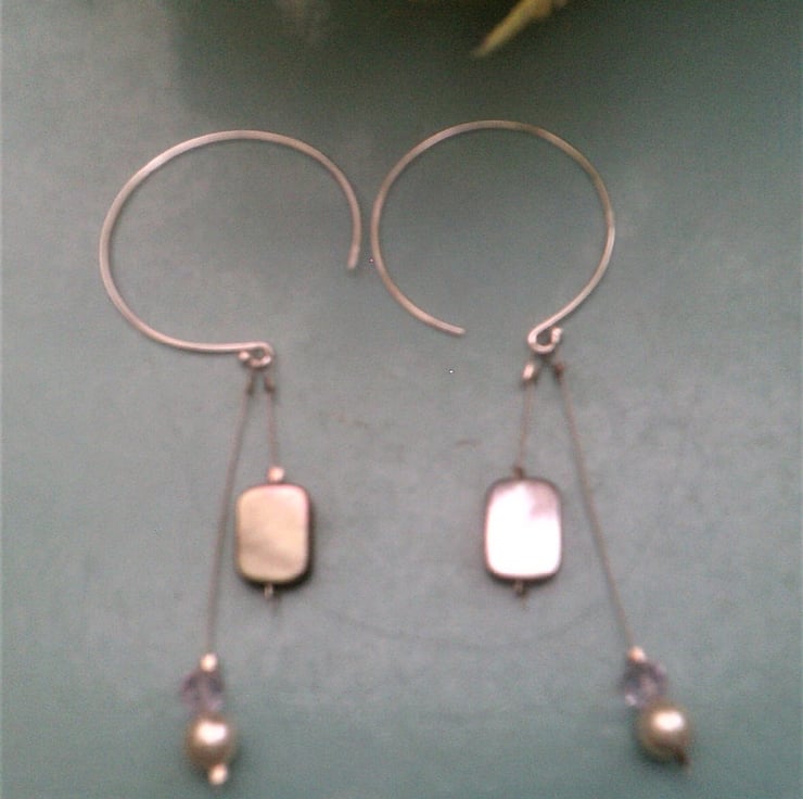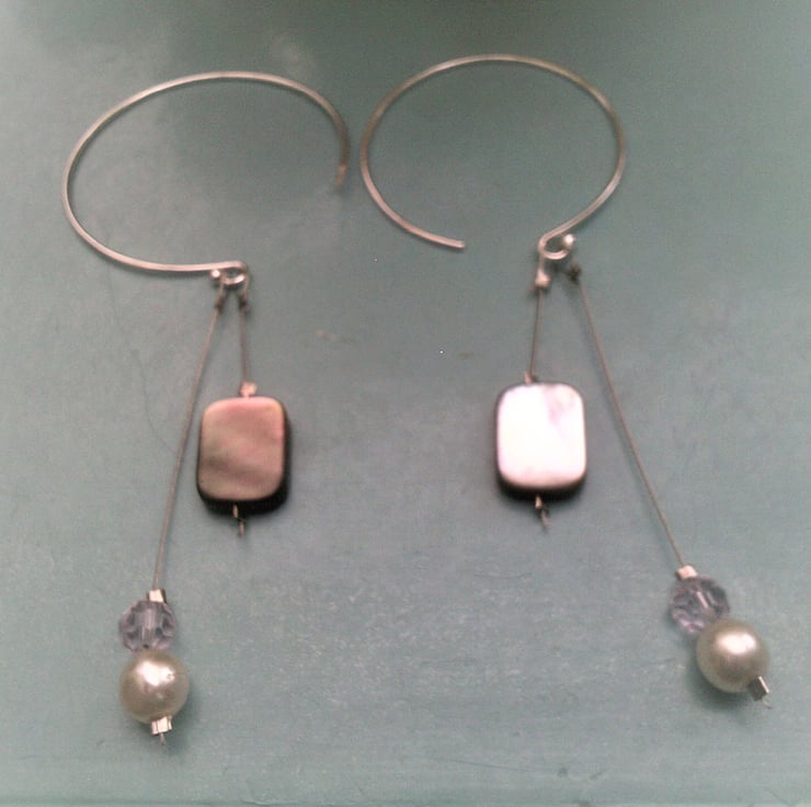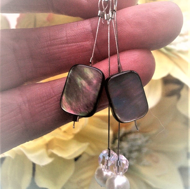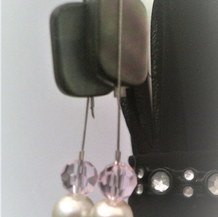 Grey mother of pearl shell earrings with off white 7mm glass pearls and sparkling pale soft pink crystals. I've used 925 sterling silver hoops to show off these shell dangle earrings, which are different and unique. There is a choice of ear hooks with shepherd hooks as opposed to the hoops.