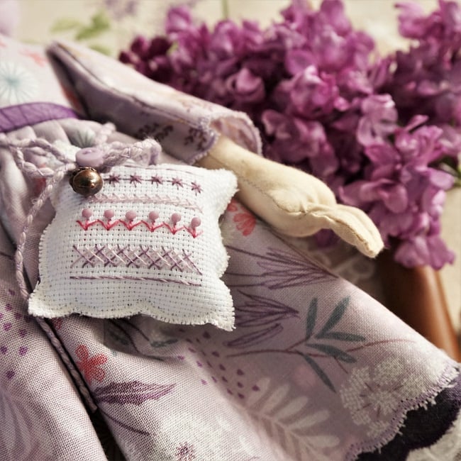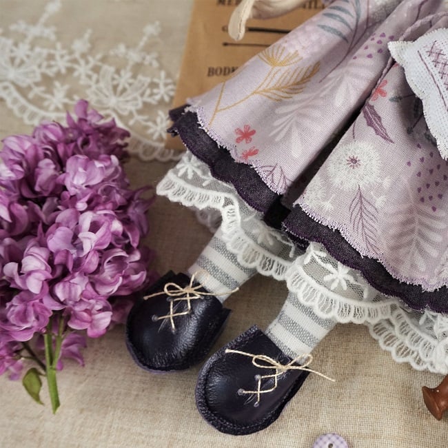 She is dressed in a Lewis and Irene print from the Fairy Clocks range, a meadow pattern highlighted with warm lilac tones and dandelion clocks blowing about. She has an acorn on her hat. Her outfit is completed with tiny buttons, leather shoes and a little sampler on her little sachet. She has co-ordinating knickers and underskirts in cotton and lace.