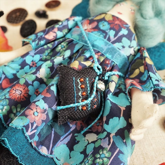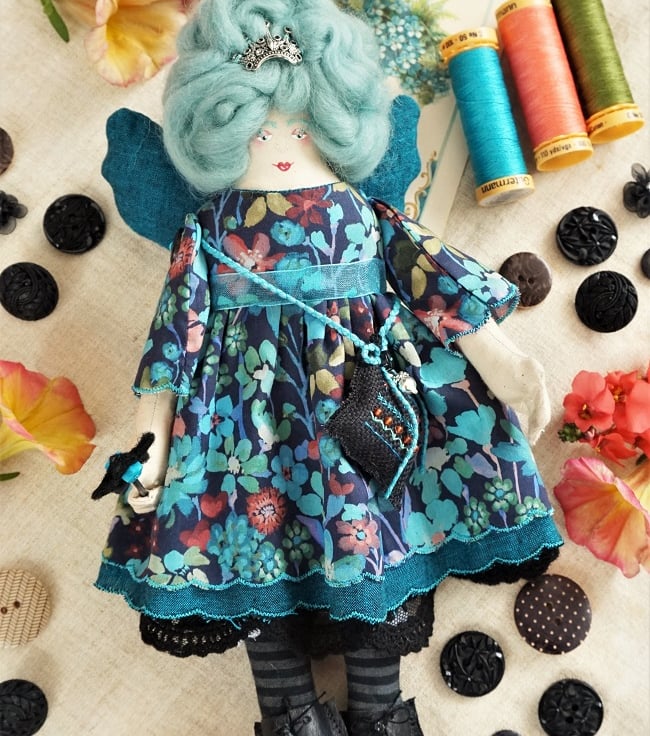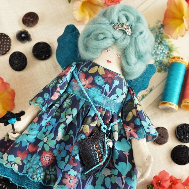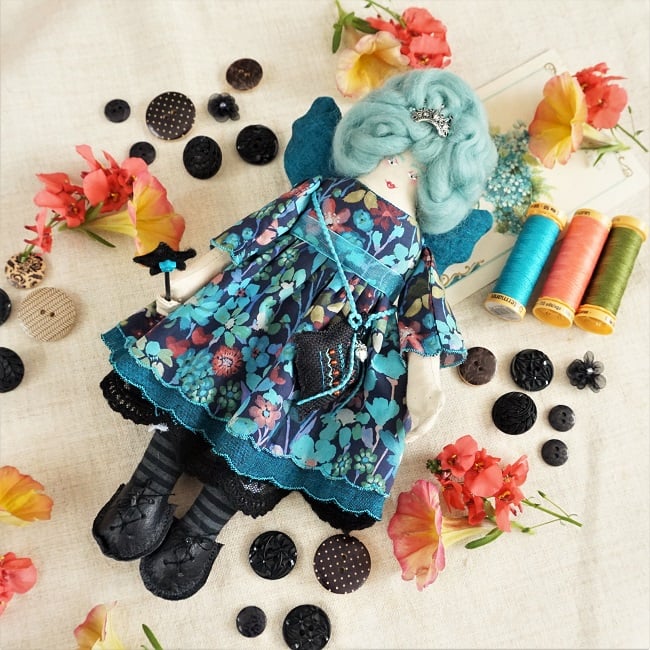 This is Cyne. A smaller pattern, she is about two thirds the size of my witch. This little Midnight Fairy God Mother has a Liberty print dress in black with meadow flowers abounding which is called Dreams of Summer. She has wings that match her underskirt and sports a little felt wand. Her shoes are the smallest I have ever made and are leather. She has a piece of turquoise to her heart with rose petals in her stuffing and is finished with tiny buttons, organza ribbon and a little coronet in her hair.