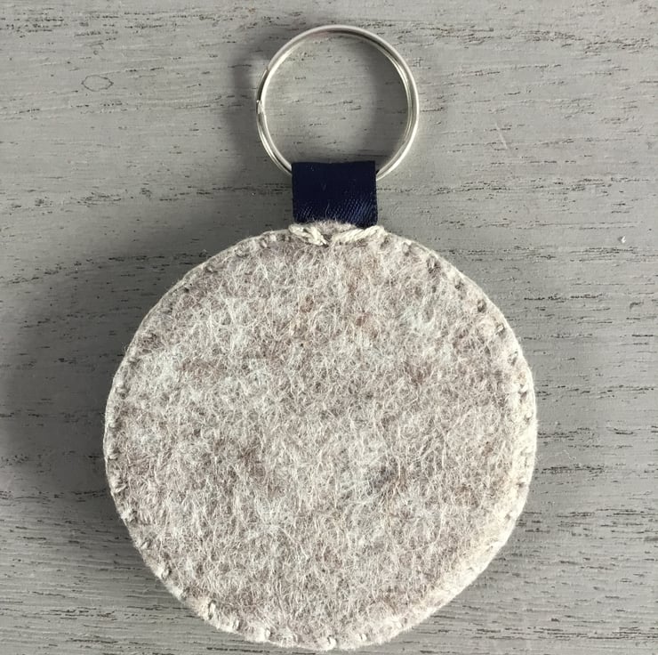 This Embroidered Keyring or Bag Charm is 2.50 inches (6.50 cms) in diameter. A metal split pin, secured with a navy blue satin ribbon is at the top. ...... ready to attach a key or to accessorise a bag.