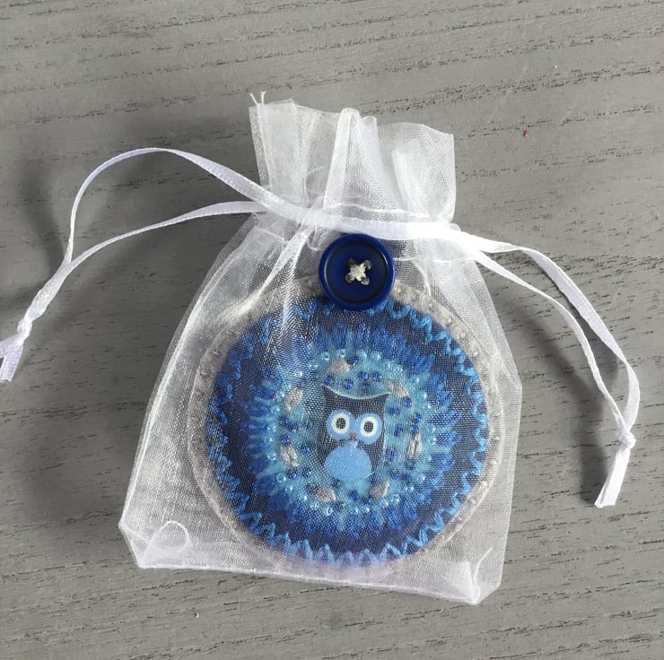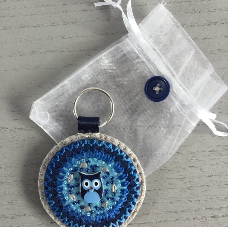 This Embroidered Owl Keyring or Bag Charm is gift wrapped in an organza bag, decorated with a blue button. Its ready to be given as an birthday, thank you, friendship, housewarming gift or Christmas gift..... or a gift for yourself. Its light to post so makes an ideal letterbox gift. A lovely bespoke gift for anyone who likes Owls....