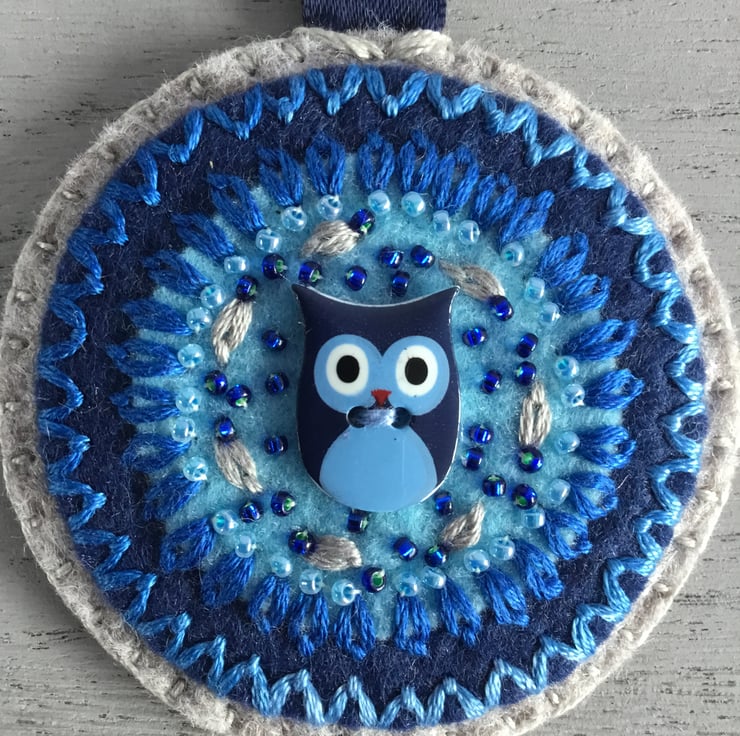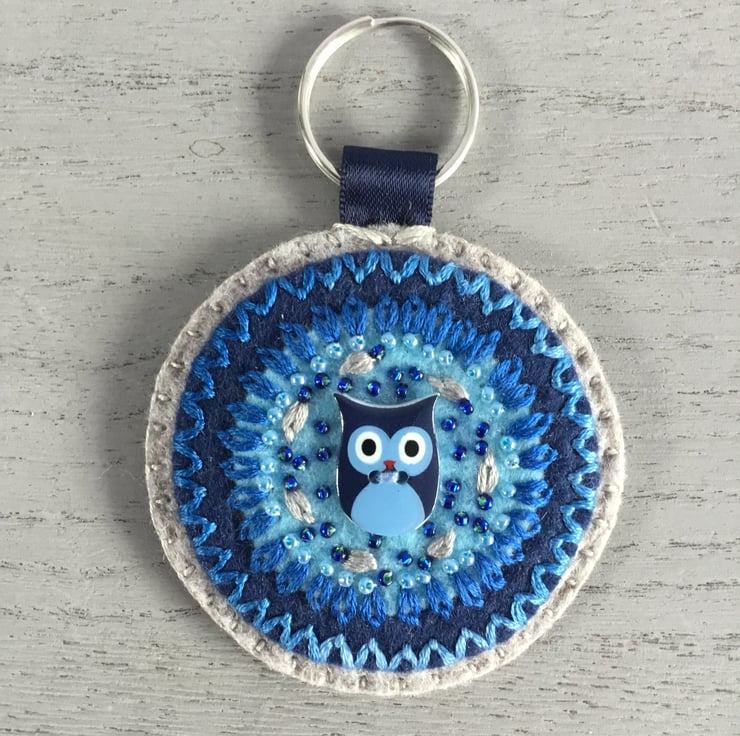 This Embroidered Owl Keyring or Bag Charm has a lovely blue Owl button stitched onto circles of blue and grey felt. This Owl button is surrounded by hand embroidered Lazy-Daisy, Fly Stitches and Blanket Stitches, dotted with blue and pale blue beads.