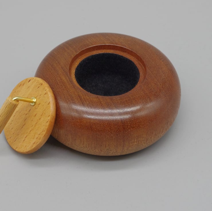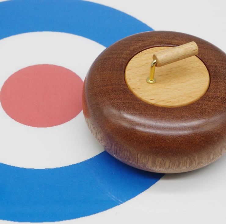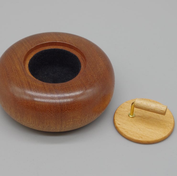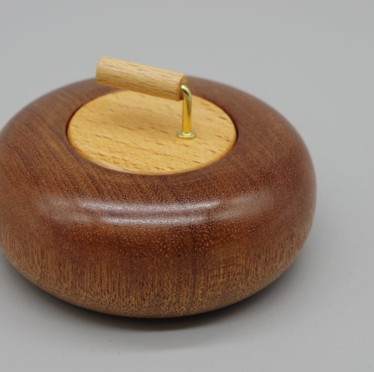 This delightful little ring box in the form of a miniature curling stone, is made from Mahogany with a beech lid.