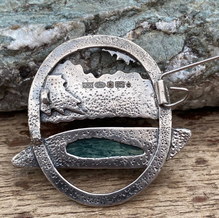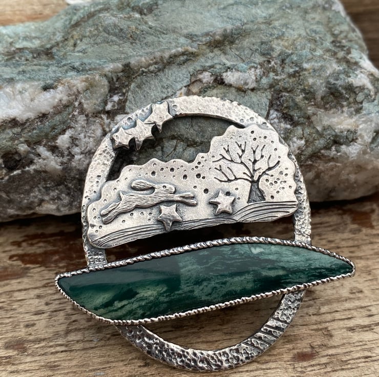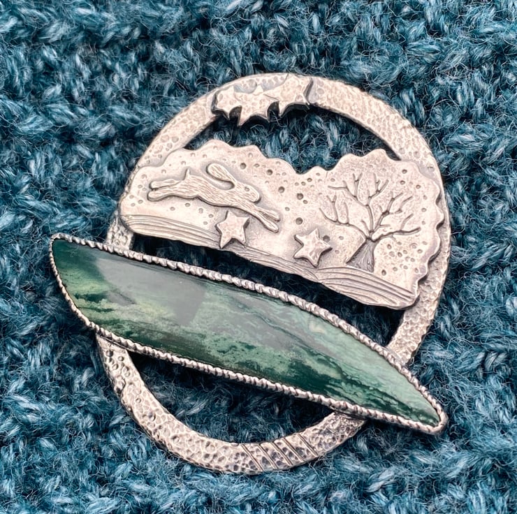 Inspired by my love of hares and nature, this brooch features a beautiful larsonite cabochon to reflect the landscape. I have hand made the brooch fitting adding a stainless steel pin for extra strength. As a slightly larger brooch it may not be suitable for delicate fabrics.