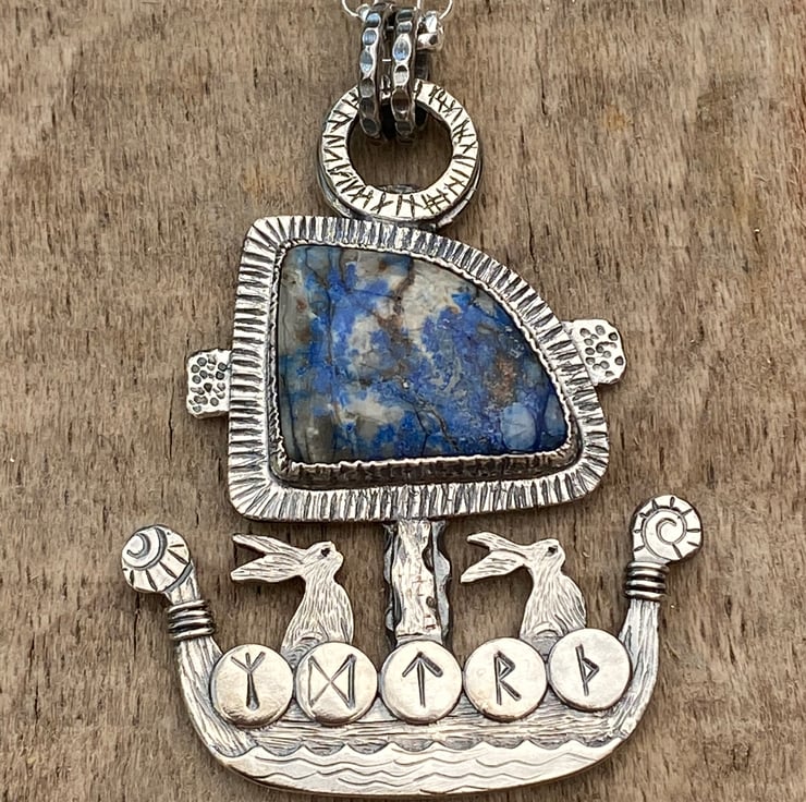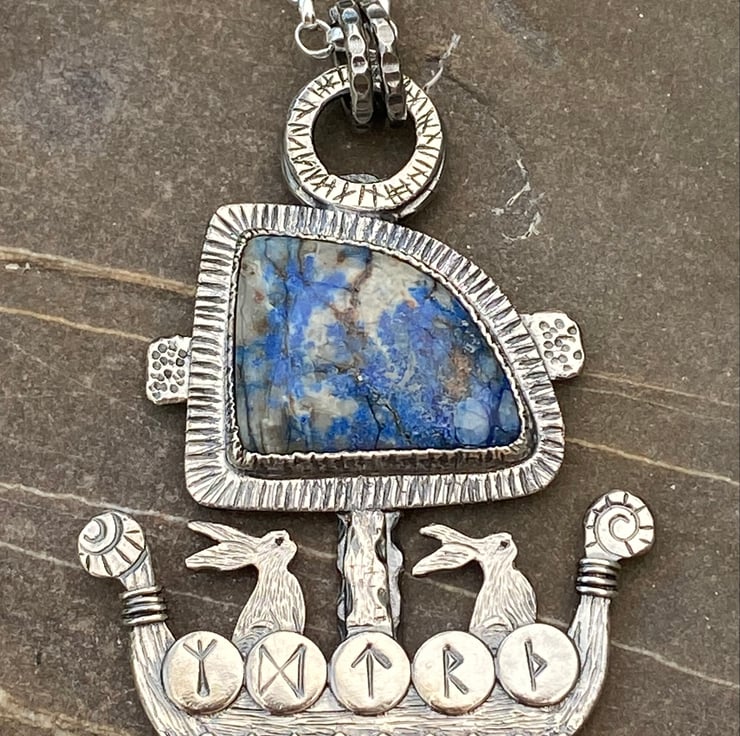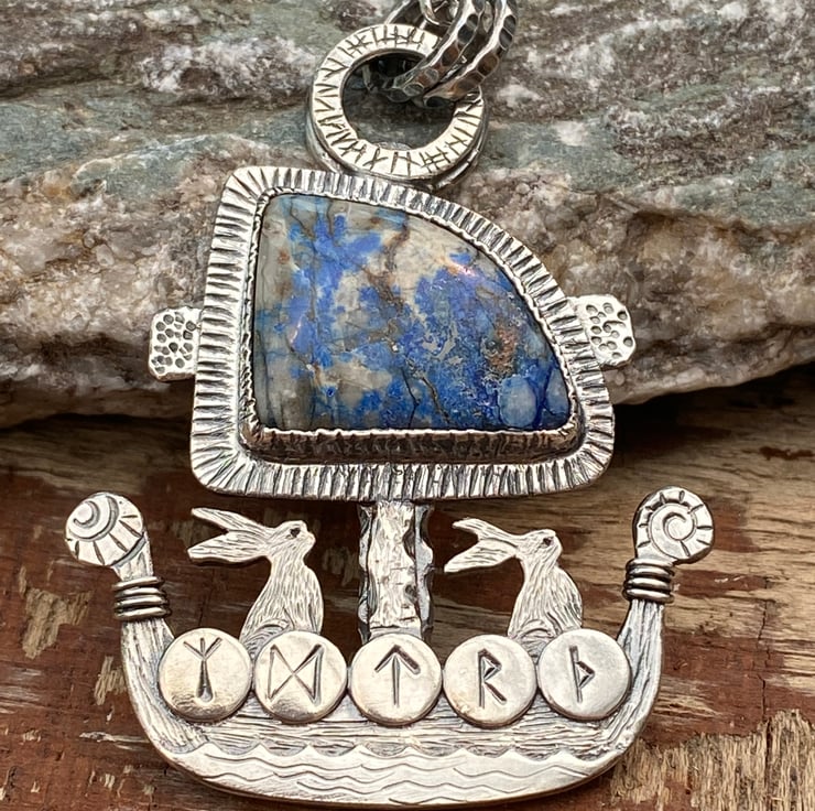 This ship has been inspired by my interest in all things Viking. With two little hares ready for adventure and discovery across the seas, with a beautiful azurite set in the sail.