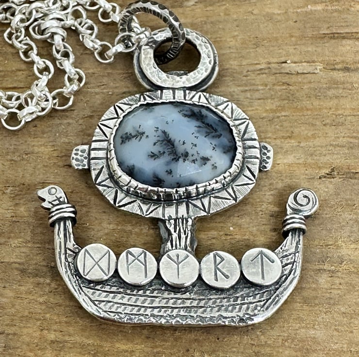 This ship has been inspired by my interest in all things Viking and has a lovely dendritic opal cabochon set into the sail.