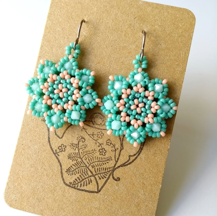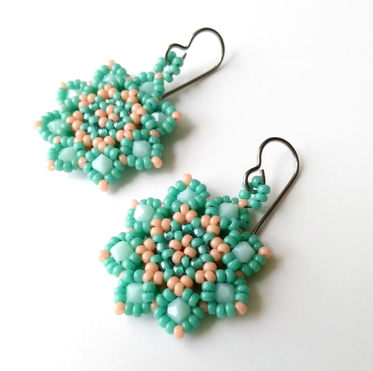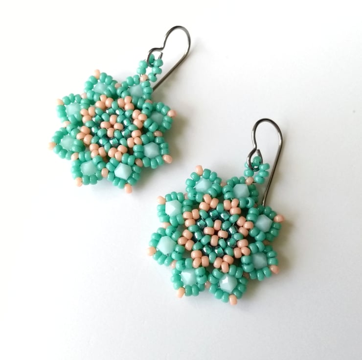 This pair features very pretty Austrian-made 4mm crystal bicones in mint opal - a milky pale green - plus seed beads in minty turquoise green and peachy pink. I think of them as ice-cream colours! See separate listings for alternative colourways.