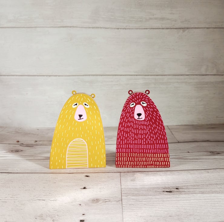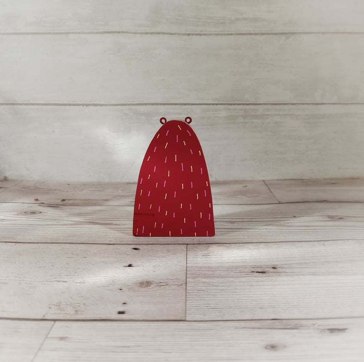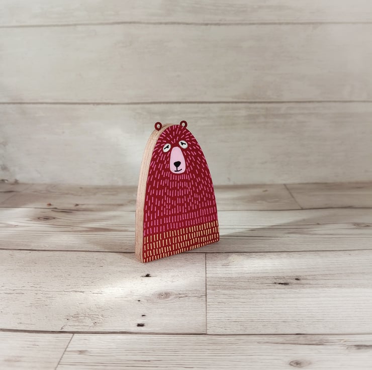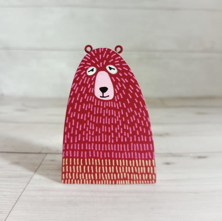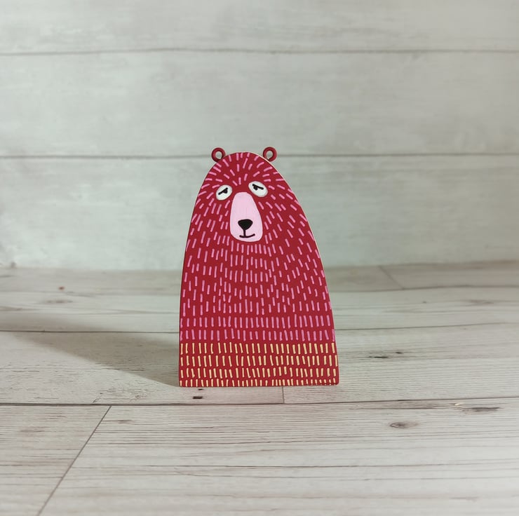 This little wooden bear has been cut from reclaimed 12mm plywood, painted burgundy and decorated with pink and orange on both sides. It has little burgundy ears and is super cute!